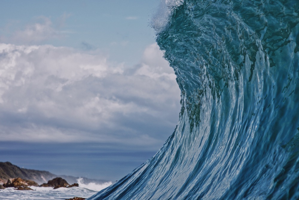 深く鮮やかなターコイズブルーの波の壁は、その表面に複雑な水の筋とハイライトを反射させ、自然の持つ力と水の美しさをダイナミックに表現しています。背景には、ドラマチックな雲と遠くの岩場が配置されており、波のスケール感を際立たせています。