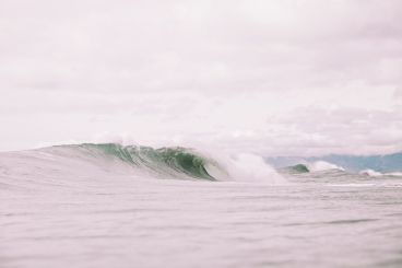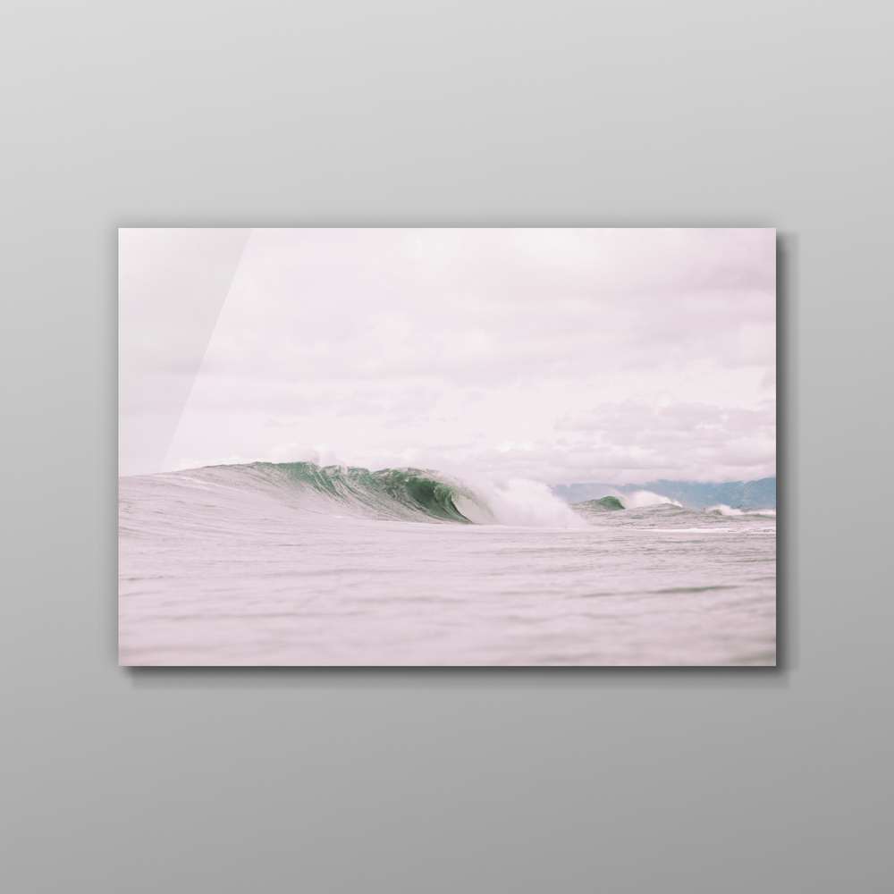 波の芯(チューブ)に見える深いエメラルドグリーンの色彩は、周囲の淡いトーンと劇的なコントラストを生み出し、自然界の持つエネルギーを際立たせています。遠景の山々の影と、水面に反射する柔らかな光が、この一瞬の美しさに深い奥行きを与え、観る者を静かな感動で包み込みます。