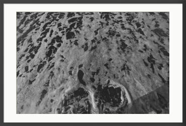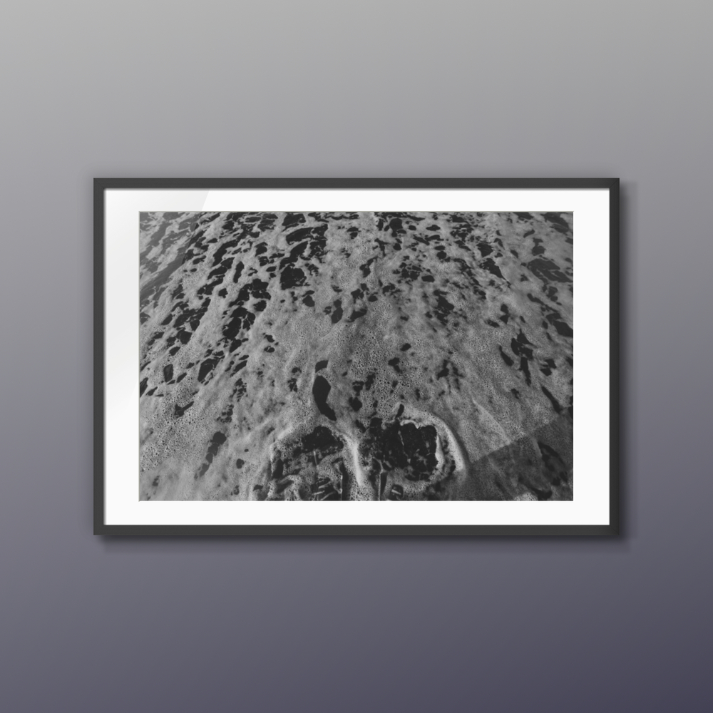 • 強烈なコントラスト: モノクロームの表現により、砂の濡れた部分の濃い黒と、泡の集合体の純粋な白が鮮明に対比されています。この劇的なコントラストが、作品のダイナミズムと力強さを際立たせています。