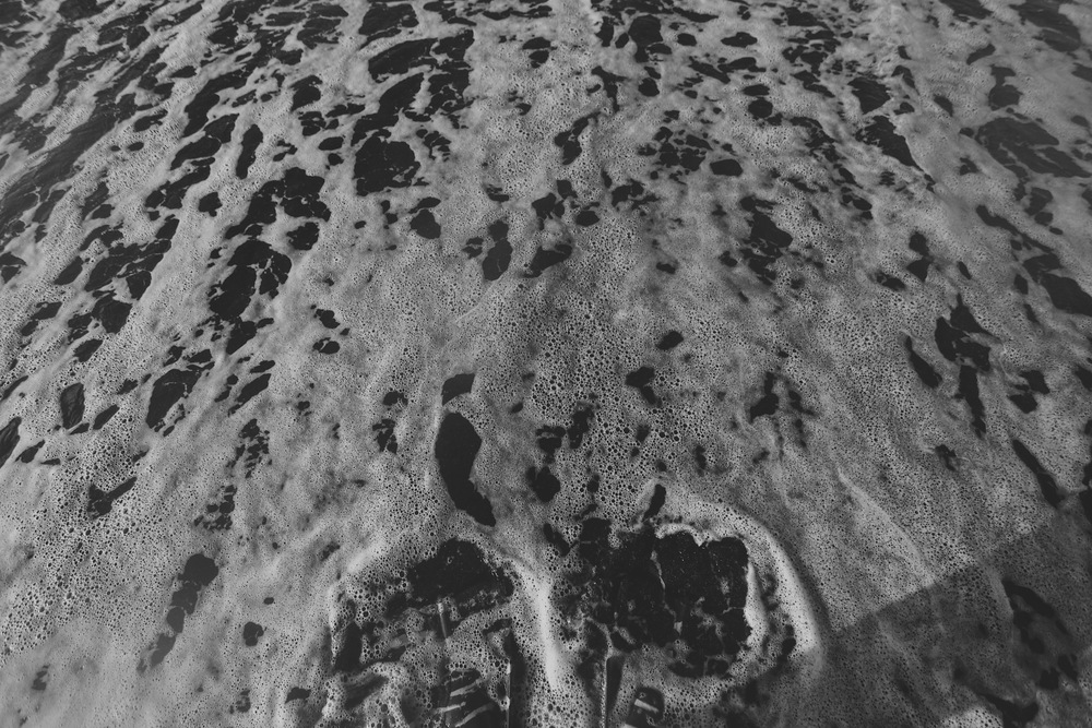 • 抽象的なテクスチャ: 画面全体が、白く細かい泡と、濡れた黒い砂のコントラストによって構成されています。このランダムでありながらパターン化された模様が、抽象絵画のような強い視覚的インパクトを生み出しています。