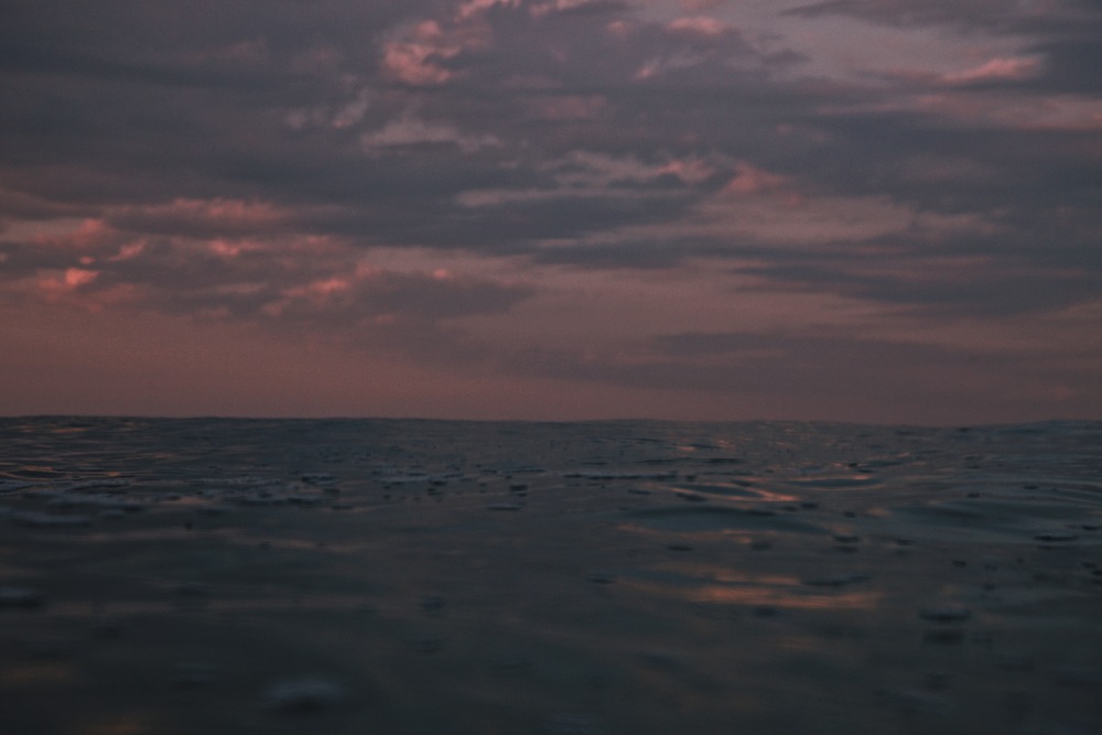 この高解像度作品は、太陽が地平線の下に隠れた後の、マジックアワーやトワイライトタイムの海景を、水面すれすれの視点から捉えています。