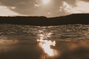 • 水面の反射と輝き: 水面が微細な波によって揺らぎ、空の光が水面に反射して、下部の水中に抽象的で美しい光のモザイクを創り出しています。この反射の表現が、作品に深みと動きを与えています。