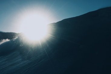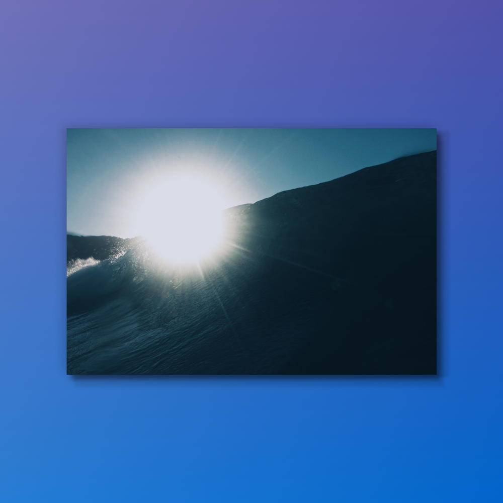 • 圧倒的な太陽光: 画面中央でまばゆく輝く太陽が、強烈な光芒を放ち、見る者の視線を釘付けにします。 • ドラマチックなコントラスト: 太陽の強烈な光(ハイライト)と、その手前で巨大な影としてそびえ立つ波の壁(シャドウ)の対比が、緊張感と感動を生み出しています。 • 躍動感と静けさ: 波が砕ける左側の水しぶきと、波の向こう側に広がる静かな空と光が、動と静の絶妙なバランスを保っています。
