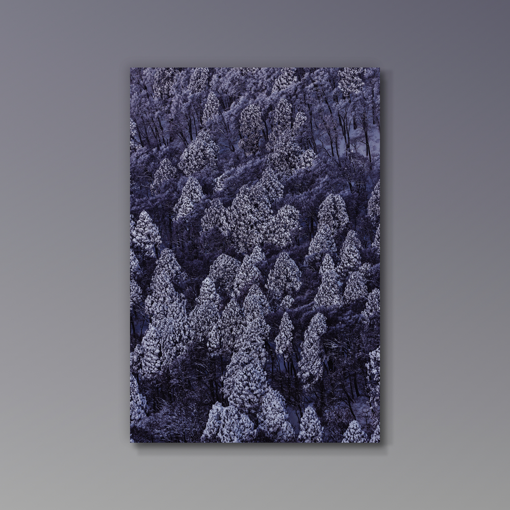 深い雪に覆われた冬の森を、上空から捉えたような独特な視点のキャンバスアートです。暗い紫と白のコントラストが際立ち、自然の持つ緻密さと神秘性を表現しています。