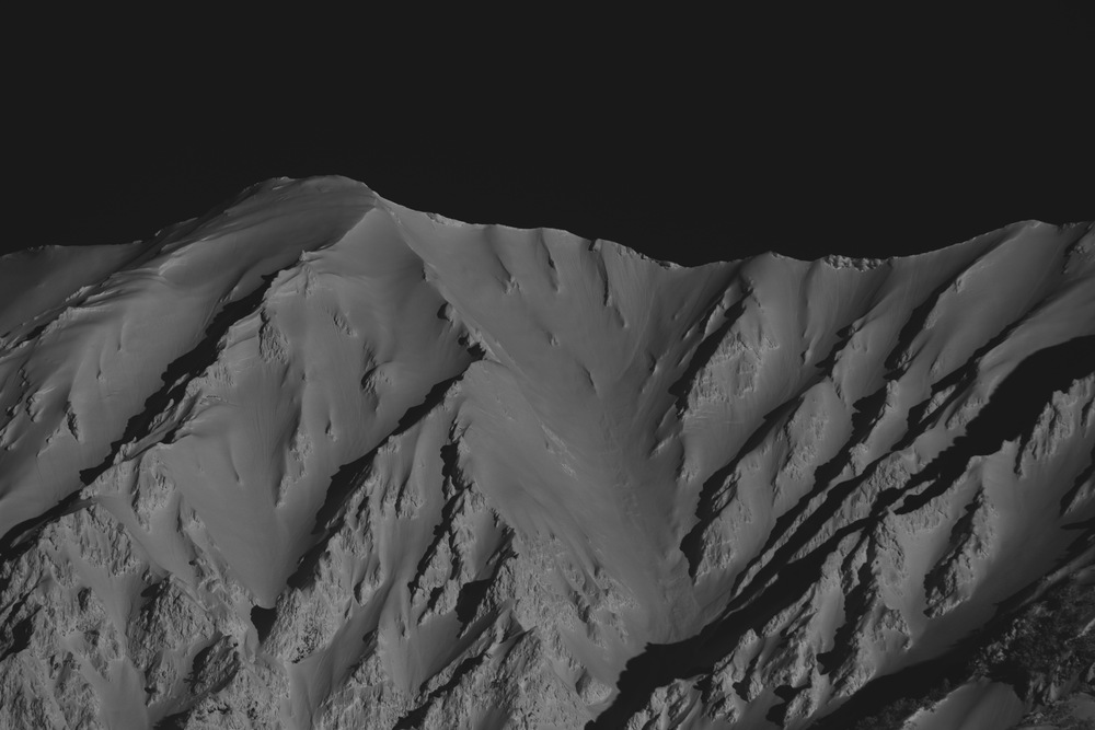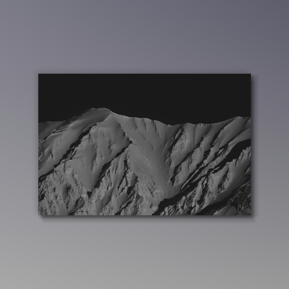 • ミニマルな構図: 上部が完全に黒い空(または夜空/影)で切り取られており、山脈のシルエットが非常にシャープで印象的です。この極端な対比が、作品に現代アートのようなミニマルな緊張感を与えています。