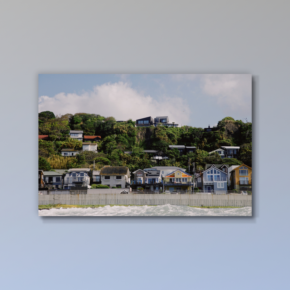 • 息をのむような風景描写: 青い空、白い雲、そして波打ち際に並ぶ個性豊かな家々。自然と生活が調和する、湘南ならではの情景が鮮やかに表現されています。