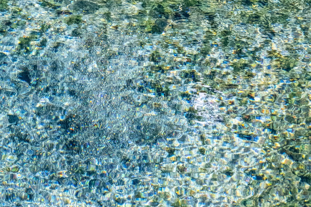 阿蘇郡南阿蘇村「白川水源」 湧き上がる水によって立ち昇る砂 太陽光が反射し細かい虹色が輝いていた