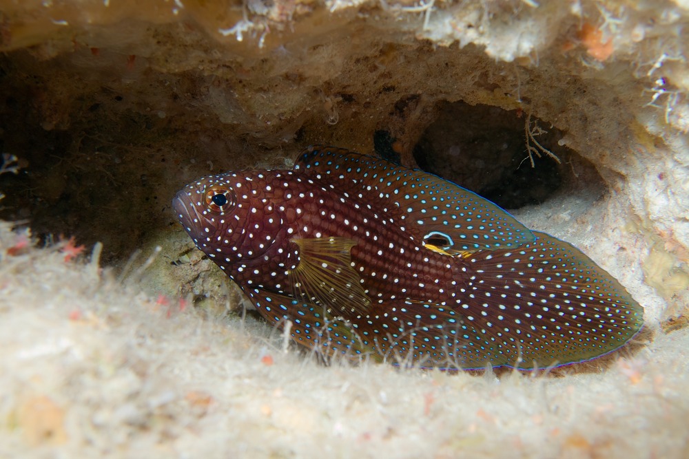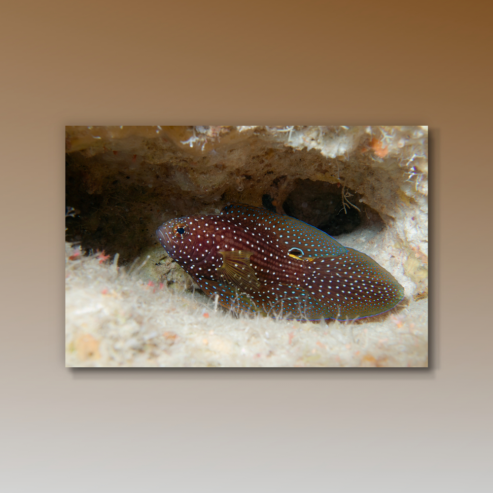 沖縄の伊江島、カナン崎ドームで撮影しました。最近も良く潜るのですが、この子には全然会えません。一期一会だったなぁと思う写真です。この魚は洞窟住まいですぐに隠れるので、これより良い写真は撮れたことがありません。ベストショットです。とある潜水団体のフォトコンで賞を頂きました。