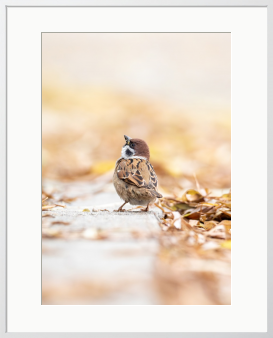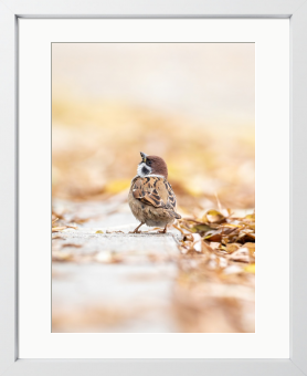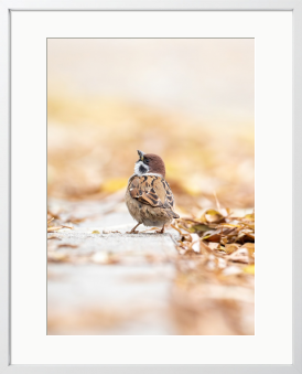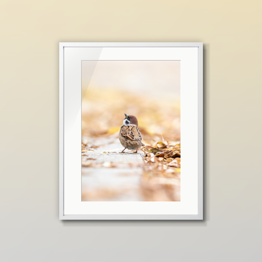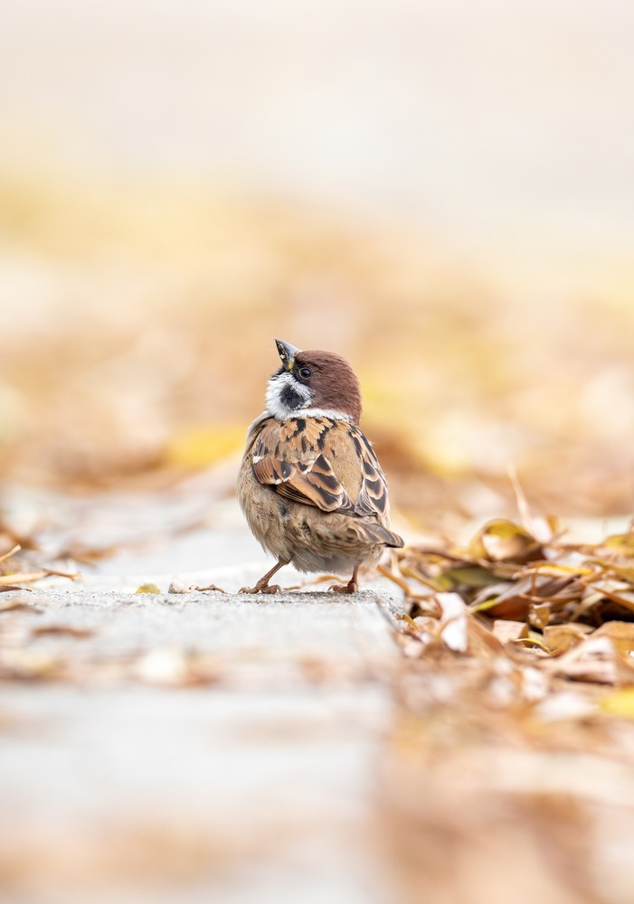 紅葉が散った後、少し寂しげに空を見上げるスズメの後ろ姿を撮影しました。