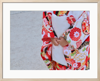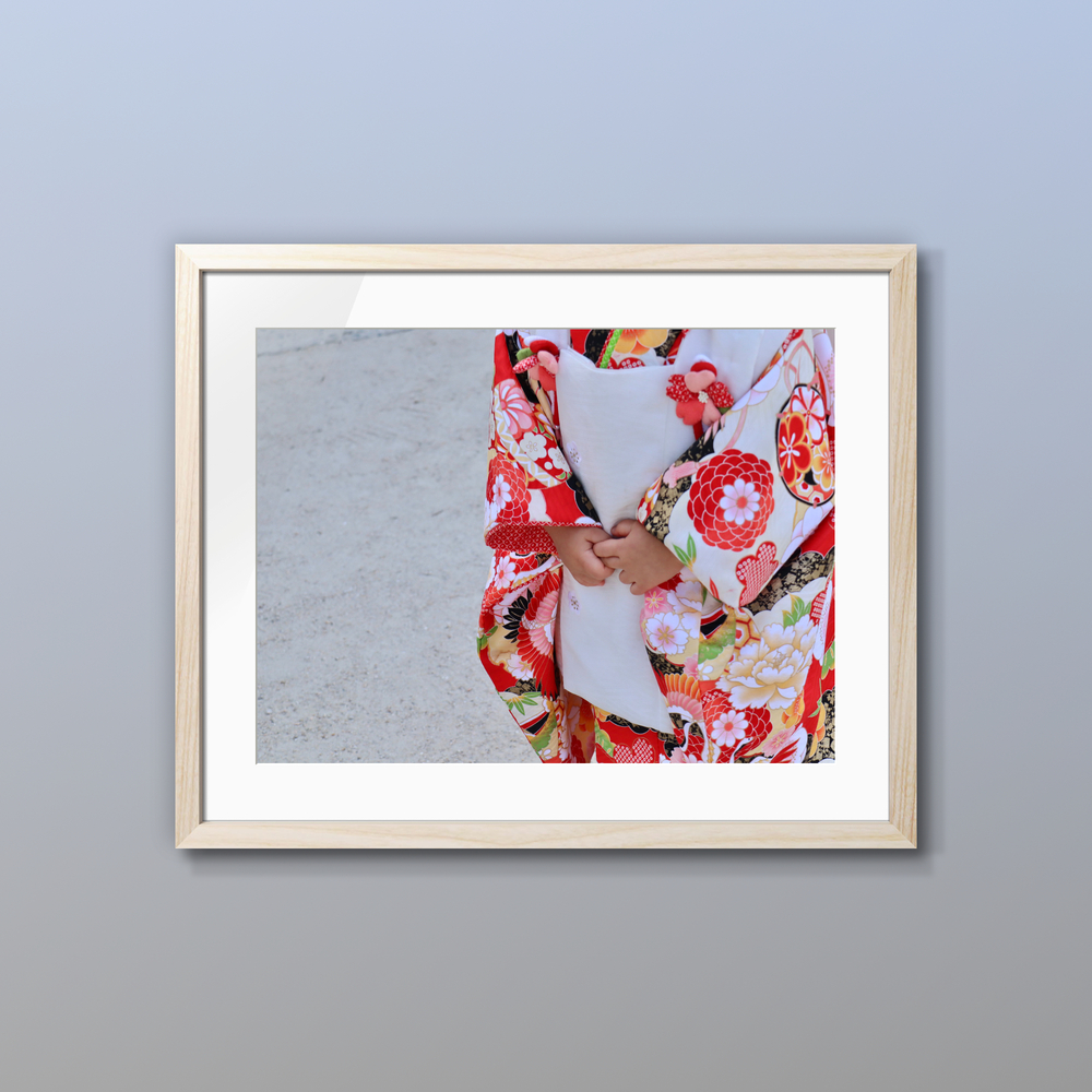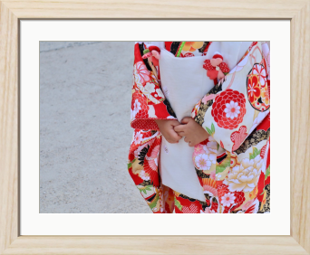 Title:七五三の伝統の和柄着物とお行儀良く重ね合わせた小さな両手
