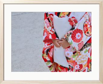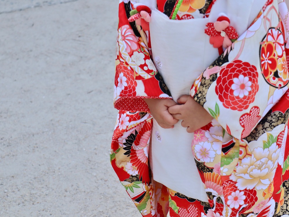 鮮やかな赤地に咲く花柄と絵羽模様が美しい、典型的な七五三の祝い着。 祝いの象徴「まり」「鶴」「牡丹」が描かれ、成長と幸福を祈る日本ならではの美にフォーカスした写真。 子供の着物に関連する上質な和の空気感を演出する素材として使いやすいように撮影。 握ったように揃えている小さな手も幼く愛らしい。
