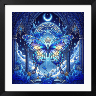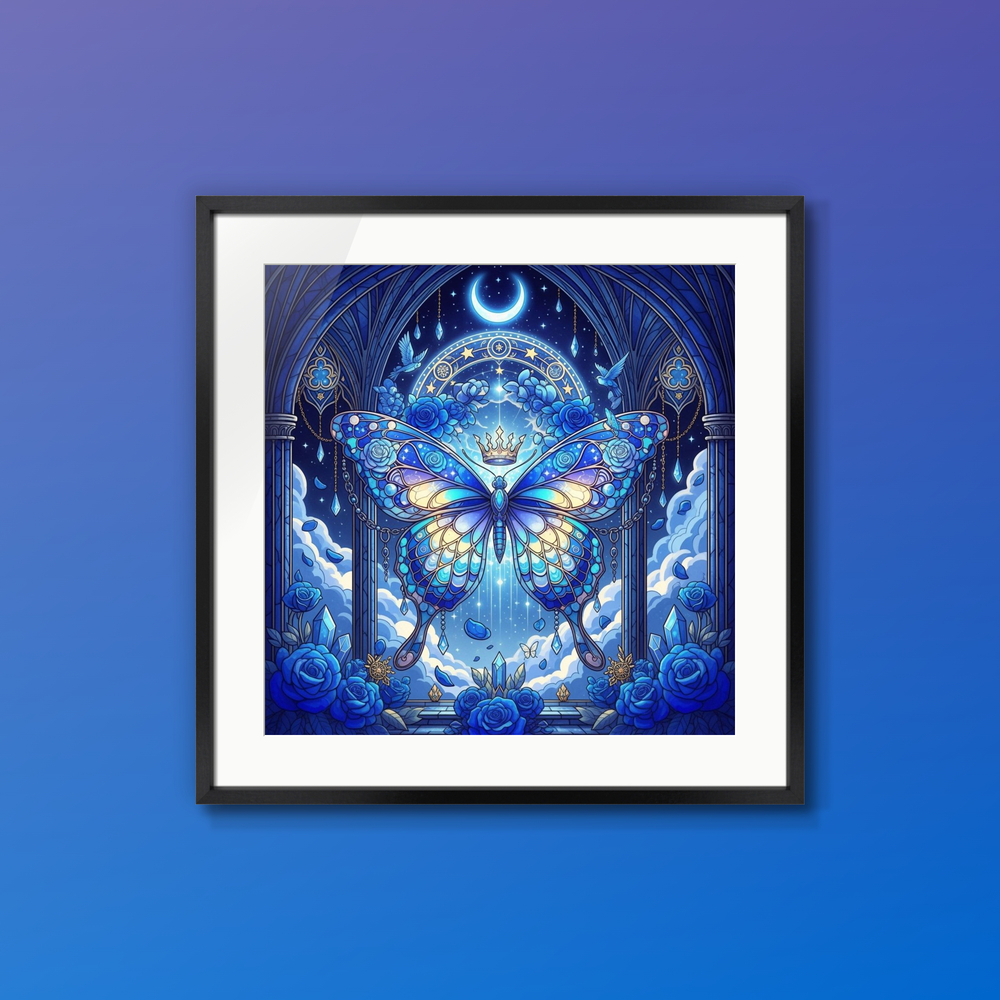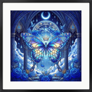 「蒼天」「瑠璃華」「飛翔」といった日本の詩的な言葉が象徴として作品に込められており、無限の空の広大さと、儚くも美しい蝶のエレガントさを表現しています。静寂と神秘に満ちたこの「瑠璃薔薇幻園」は、見る者を天上の世界へと誘います。