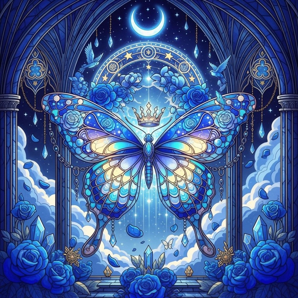 この作品は、AIで生成した光を放つステンドグラスで描かれた、天上の庭園の情景です。中心には、瑠璃色に輝く荘厳な蝶が舞い、その羽には星の星座や天上のバラの螺旋が描かれています。蝶の頭上にはサファイアと黄金の冠が輝き、やわらかな光を周囲に放っています。