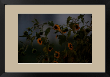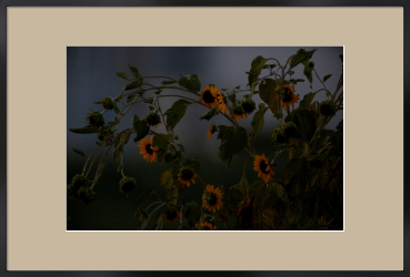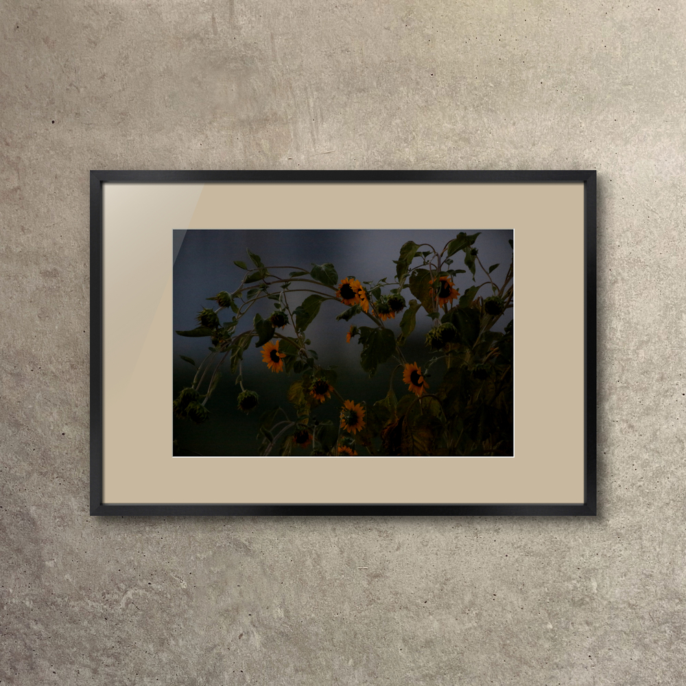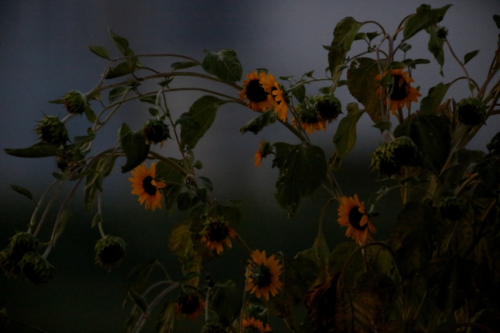 畑の片隅に一株だけ残されたひまわり。まだ花は咲いていますが、株は傾き、強風が吹けば根こそぎ倒れそうです。何十株も固まって咲いていた頃には皆通り過ぎていたのに、今は散歩で通りかかる人たちがこの株の前でよく立ち止まっています。