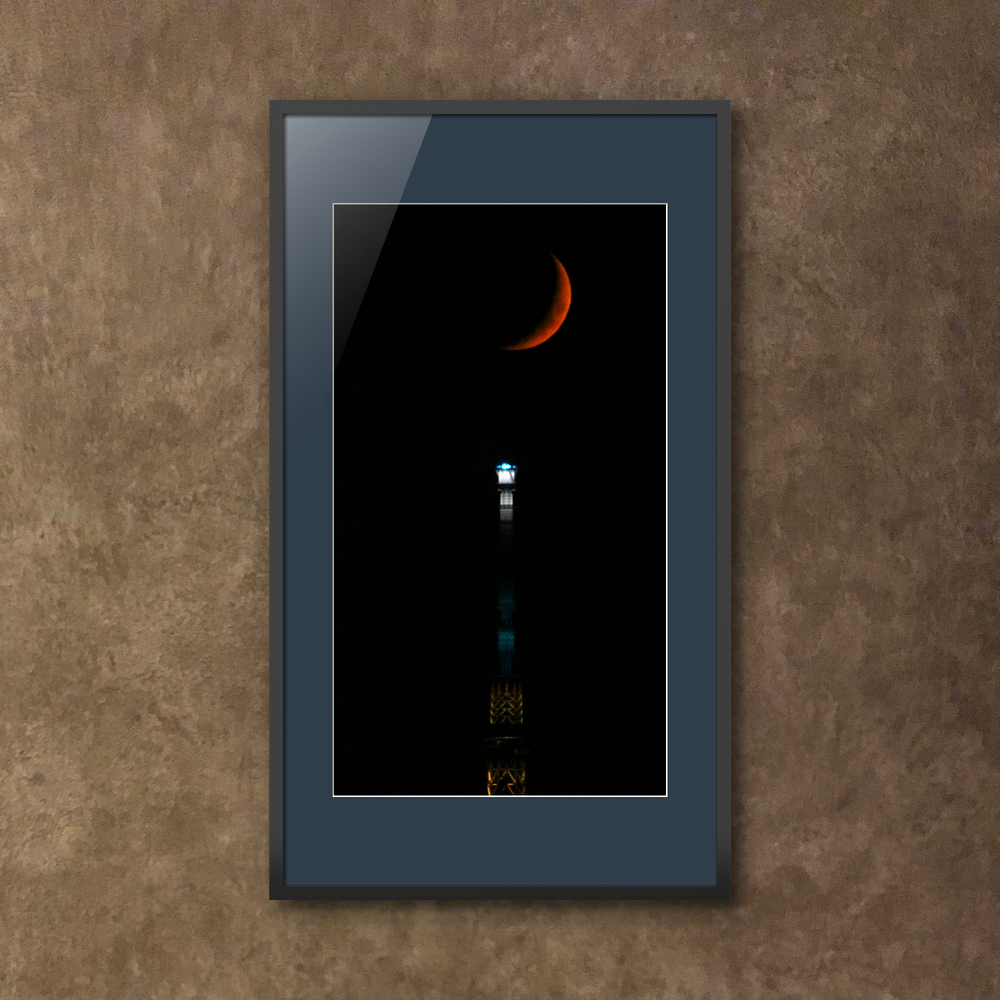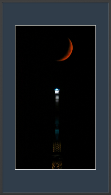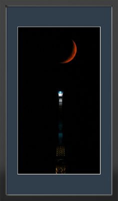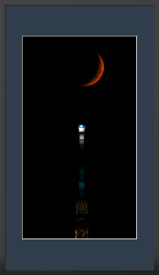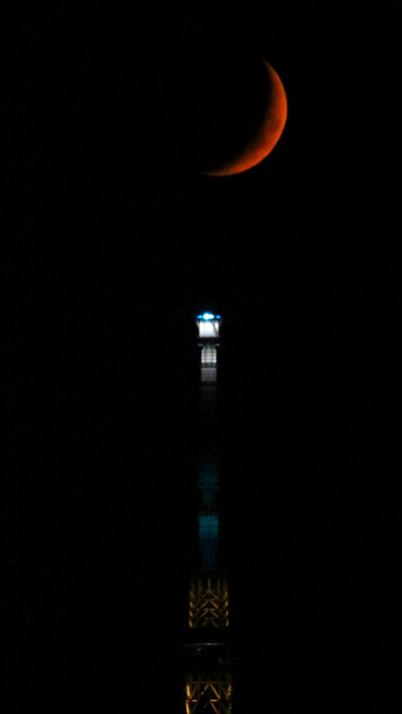 スカイツリーの上に浮かんだ三日月。敢えて、真上ではなく、少しずらしています。