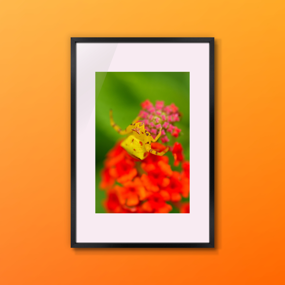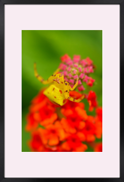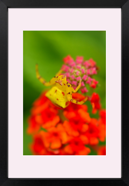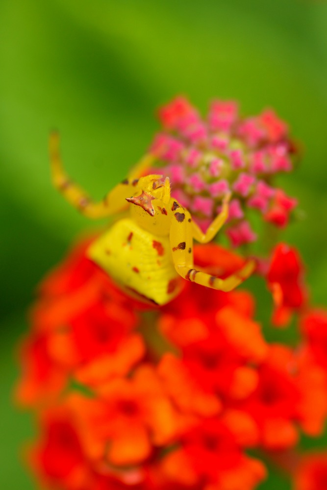 アズチグモという花蜘蛛の一種です。同じ個体でも止まる花の色に合わせて2-3日で白、緑、黄色など体色を自由自在に変えることができる「忍者グモ」です。
