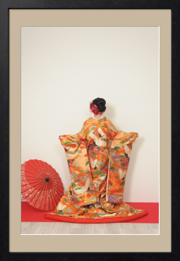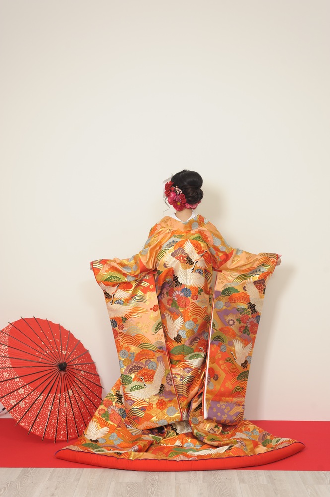 Title:豪華な和装、色打掛を着た女性の後ろ姿と赤い和傘