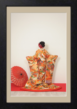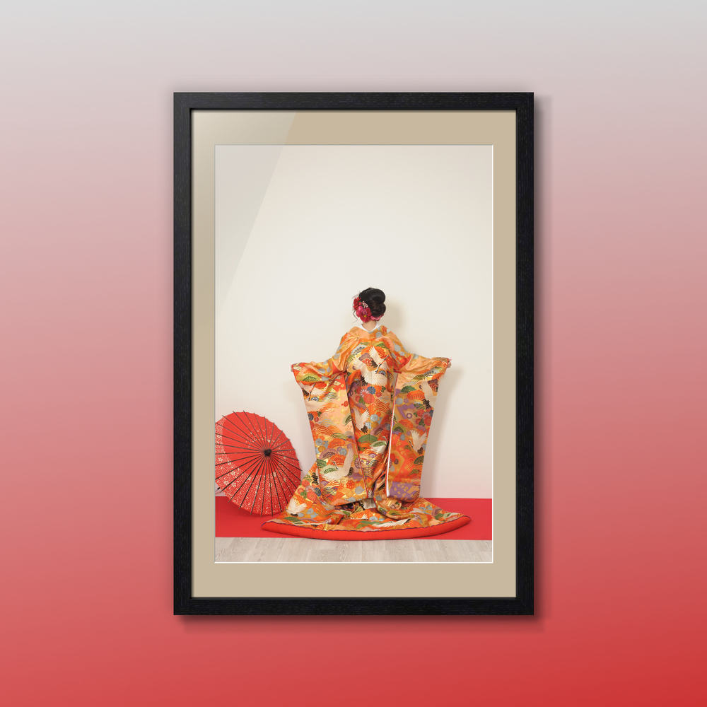豪華で華麗な鶴と花模様の舞う色打掛。 格式高い伝統衣裳の美しさを最大限に表現するため、柄が映える後ろ姿で撮影。 赤い和傘を添え、神前式の厳かで洗練された高級感あふれる雰囲気を演出。 日本の伝統美を象徴する希少な一枚は、洗練された和の世界観を持ち、 ハイエンドな商用デザインやコレクション用途にもふさわしい価値を持ちます。