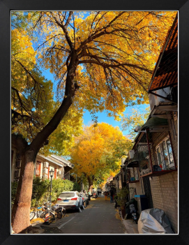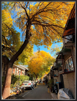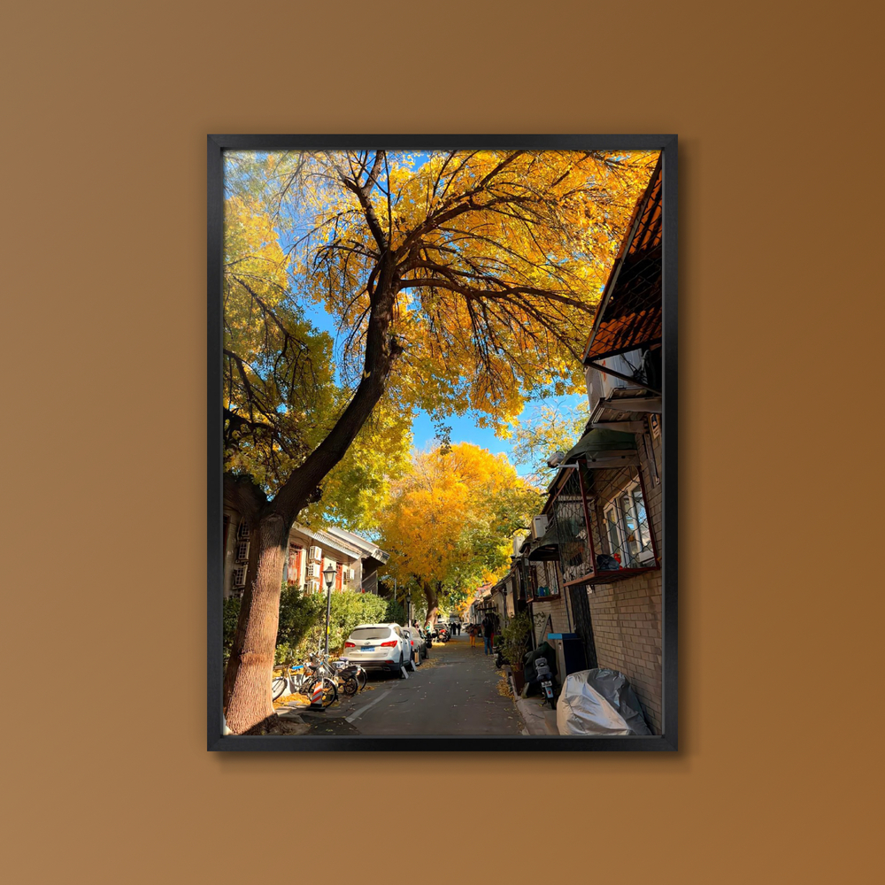 光に透けるイチョウのような黄金色の葉は、見る人に生命力と安らぎを与えます。太陽の光と木々の影のコントラスト、そして路地を歩く人々の日常の様子が、この写真に物語性と生きた空気感をもたらしています。