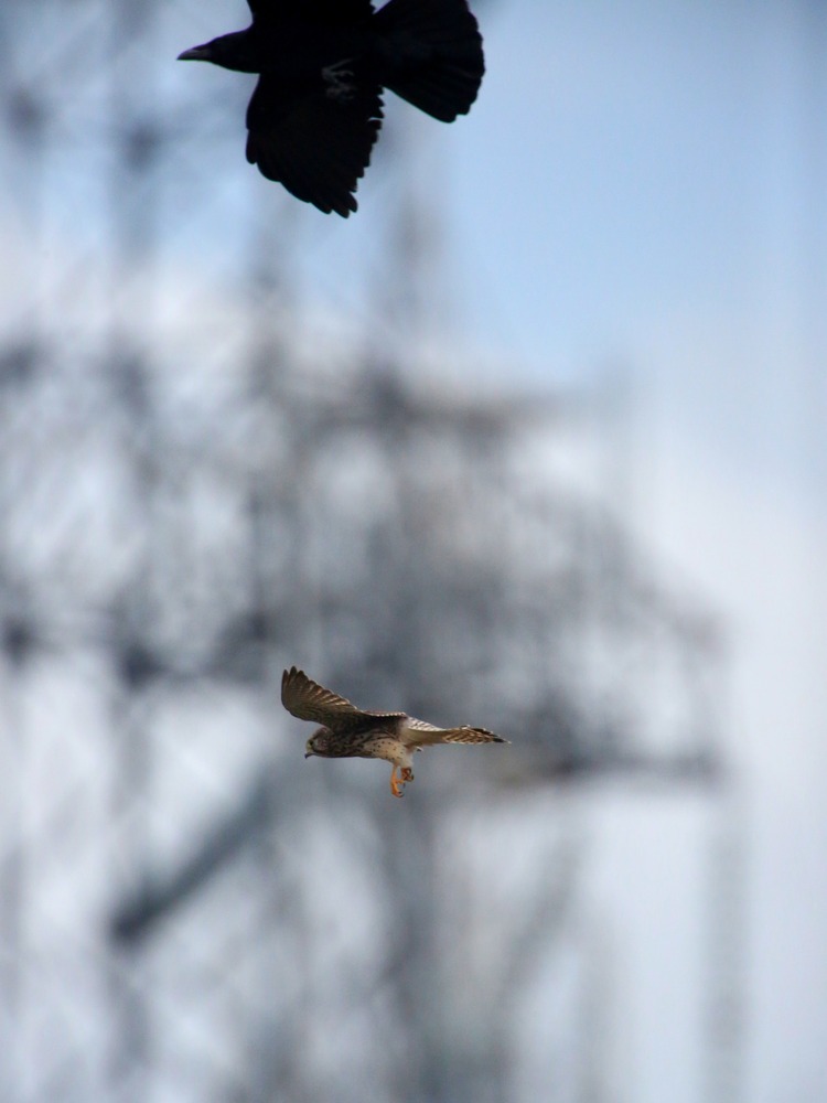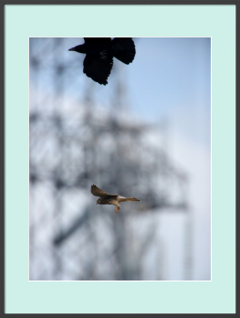 今年巣立ったチョウゲンボウの幼鳥と執拗に付きまとう(モビングする)カラスです。カラスは一羽だけでなく、3-4羽で幼鳥を取り囲み、終日嫌がらせをします。