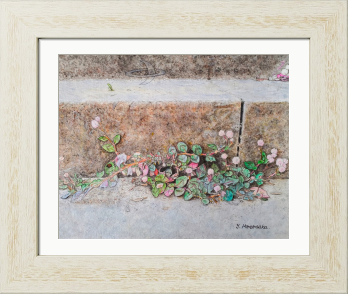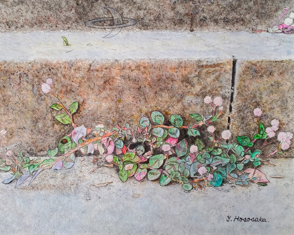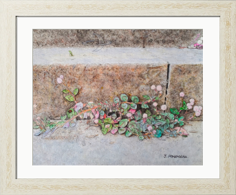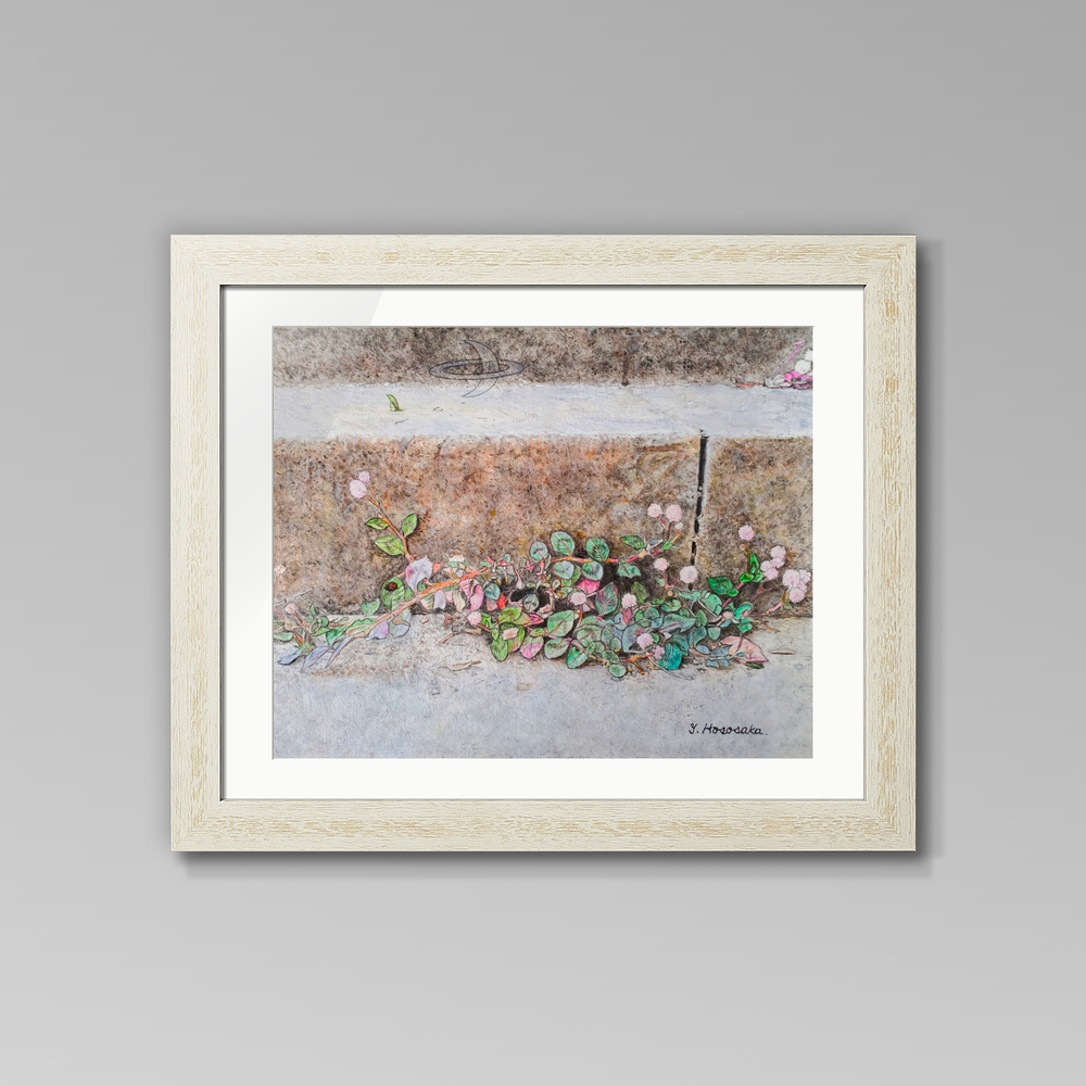 原画のタイトルは「コンクリートから生える雑草の花」(F3キャンバス/アクリル)ですが、このジークレー印刷の作品タイトルを「今、ここに咲く」に変えて『ここ咲くシリーズ』としました。どうぞ、よろしくお願いいたします!
