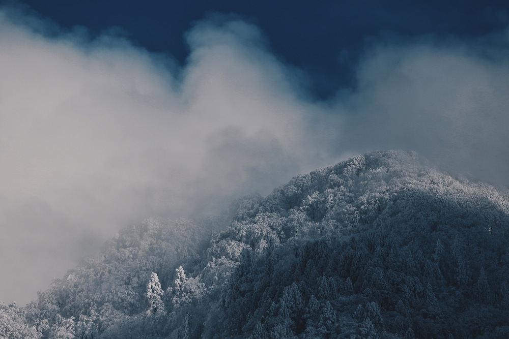 闇夜のようなディープブルーの空、そして白く立ち込める霧氷と雪に覆われた森。この計算し尽くされた光と影のコントラストは、モノクロームでありながら圧倒的な色彩の深さを感じさせます。
