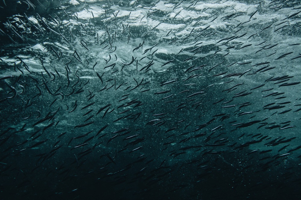 水面からわずかに差し込む光が、魚体の表面や気泡に複雑な反射を生み出し、作品全体に動きとテクスチャを与えています。写真の上部にある水面の波紋と、水底に向かって濃くなる深いインディゴブルーのグラデーションが、圧倒的な奥行きと神秘性を感じさせます。