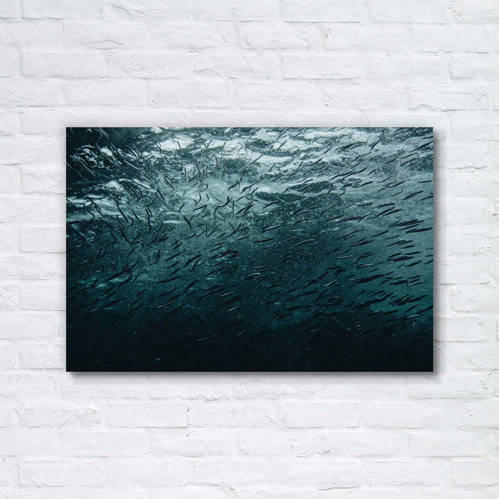 、水面近くのダイナミックな一瞬を切り取った水中写真のファインアートプリントです。無数の小魚たちが一体となって泳ぐ「群れ(スクール)」の姿が、濃密なブルーの世界の中で捉えられています。