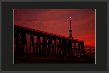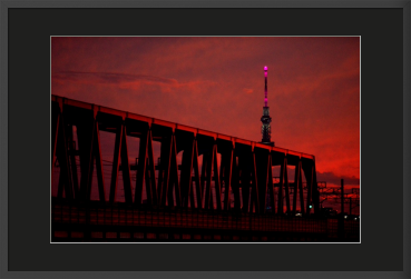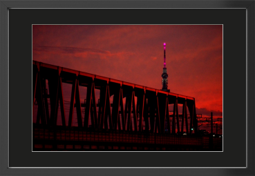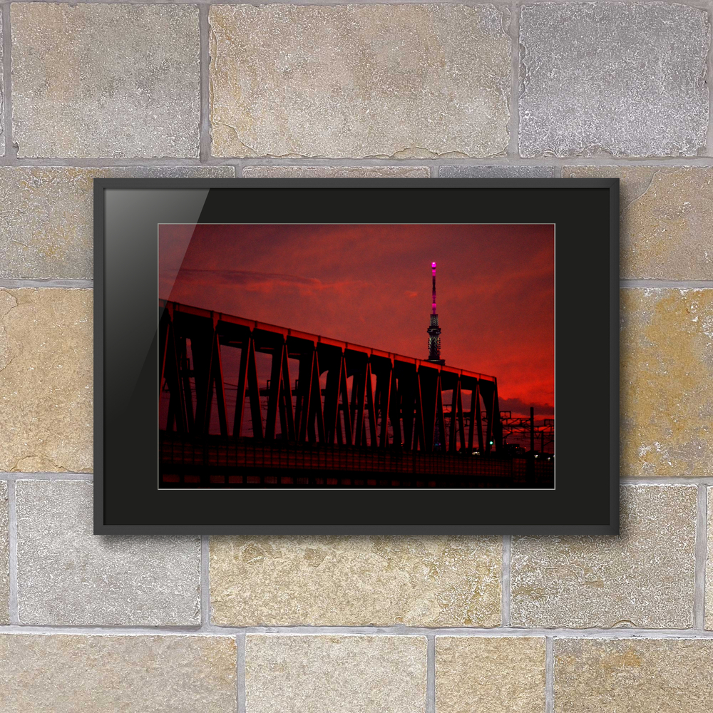 Title:江戸川夕景 ― その二 夕陽に染まる鉄橋とスカイツリー