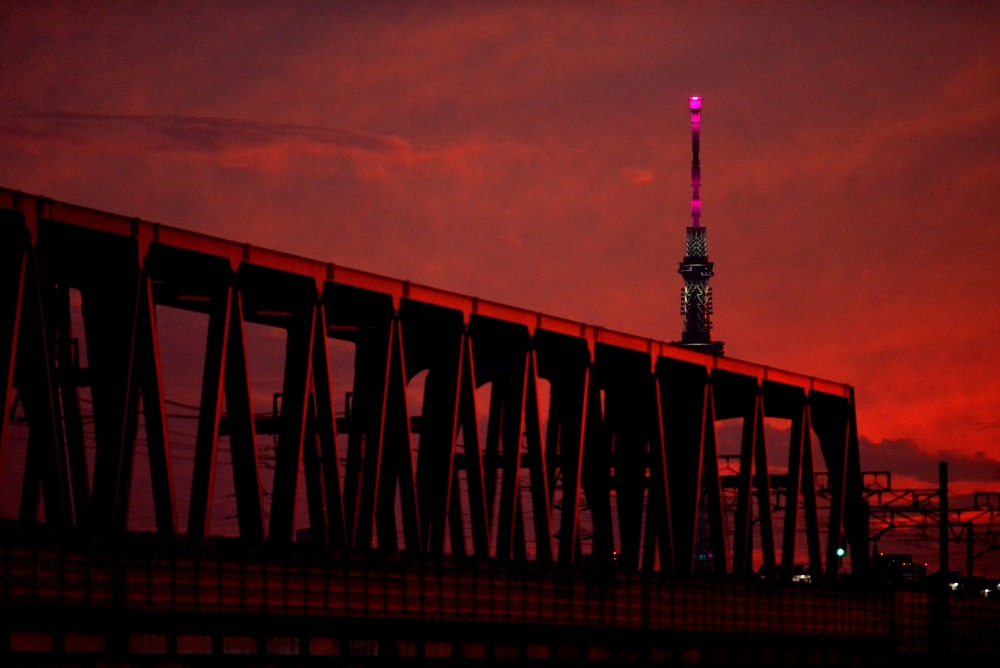 9月の夕暮れ時、夕陽を反射する鉄橋、背後にはスカイツリーも聳えています。お気に入りの江戸川風景の一コマです。