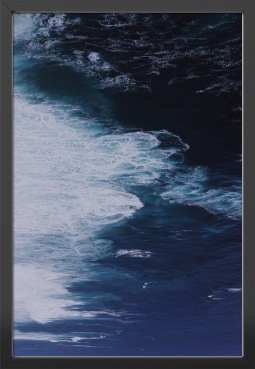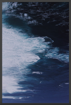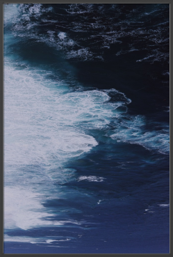 作品は、上空から捉えられたような視点で、広大な海のダイナミズムを捉えています。画面上部は濃紺や黒に近い深海の色に覆われ、下部に向かって波が砕け、白い泡となって広がる様子が抽象的な筆致のように表現されています。縦長の構図が、無限に広がる深淵と、エネルギーに満ちた波の動きを強調しています。