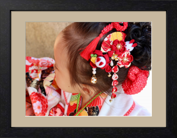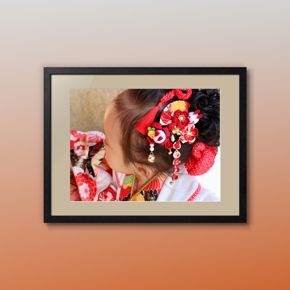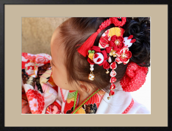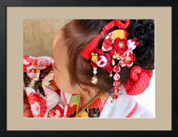これぞ日本独自の七五三文化を象徴する伝統の髪飾りとヘアスタイル。 女の子の成長のお祝いとしては、世界に誇る和の美。 晴れやかな祝福の空気も感じ、特別で上質なアートピースとしてコレクション、インテリアやギャラリー展示にも最適。