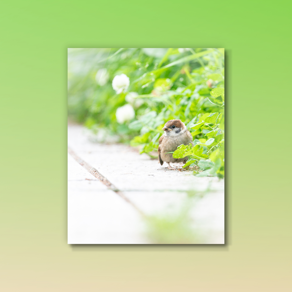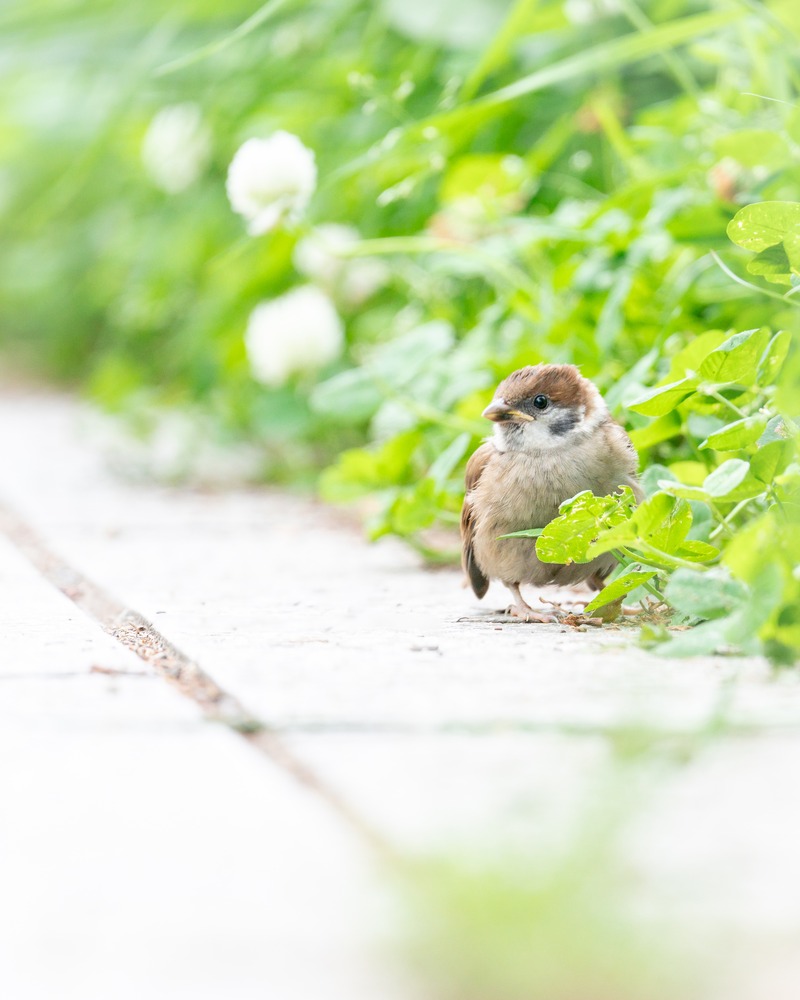 巣立ったばかりの子スズメが、地面に降り立った。不安げで、あどけない表情が愛らしい。