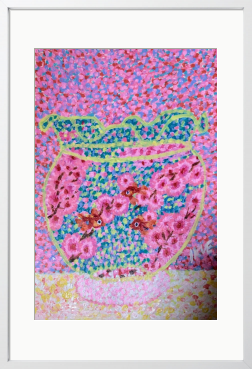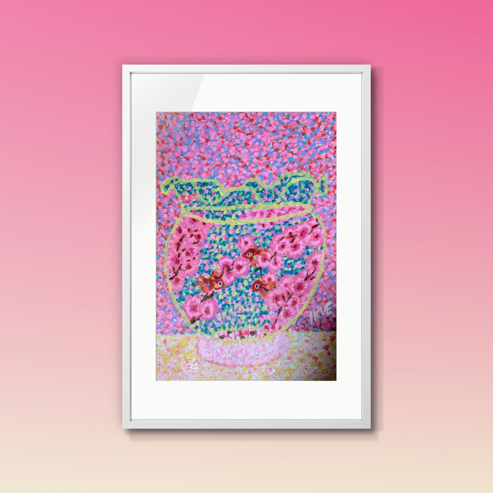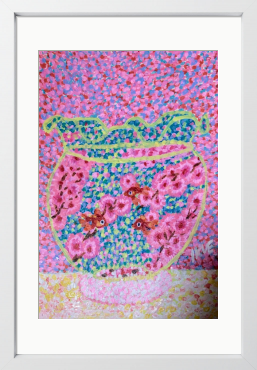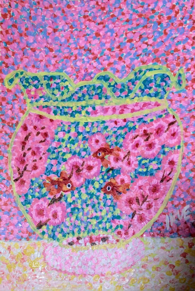 画材 アクリル絵の具 技法 点描画 金魚を飼いたくても 生き物を飼う為には 健康を保つ為の責任が 必要です。 点描画「金魚と桜」は 生き物が大切だと思う。 動物愛護の気持ちで 制作した作品です。 幻想的な癒し空間へ。