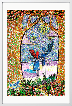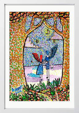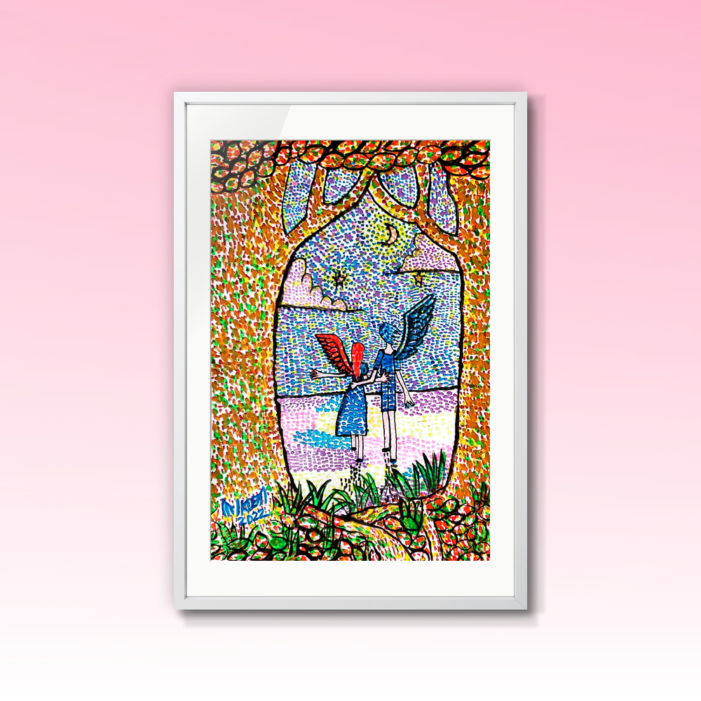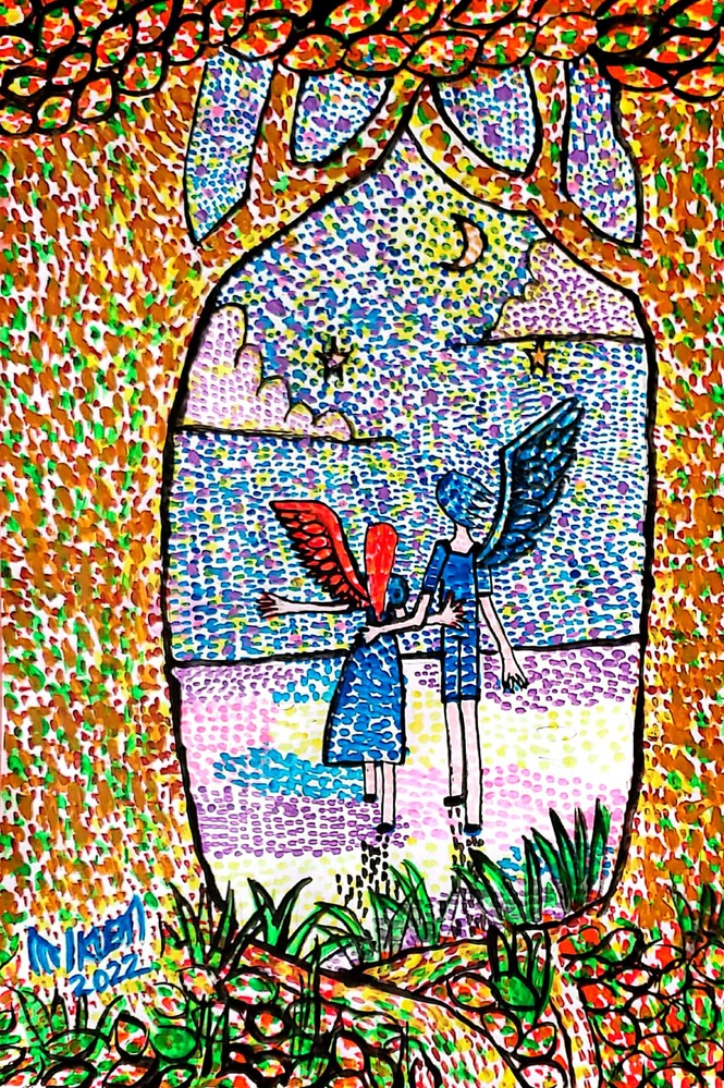 画材 アクリル絵の具 技法 点描画 片方の羽根を広げて、 支え合って歩く恋人たちを 描きました。