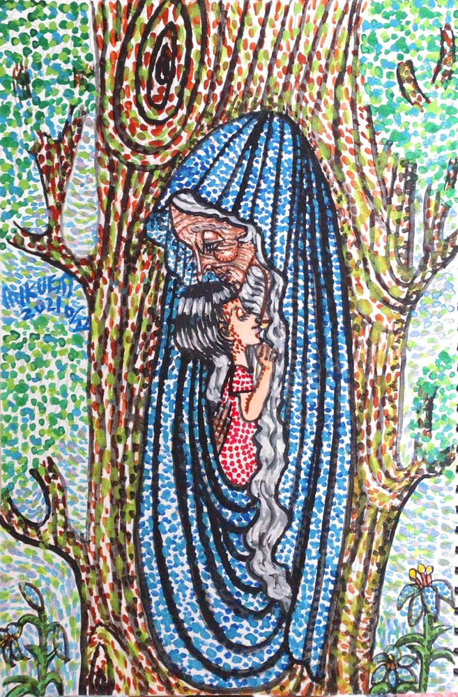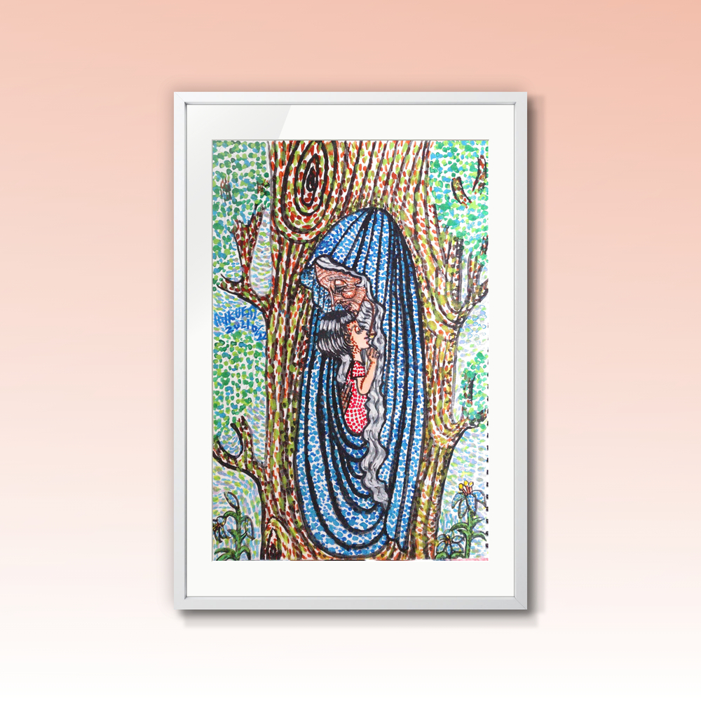 画材 アクリル絵の具 技法 点描画 子守りをする妖精と 子供の母子像。