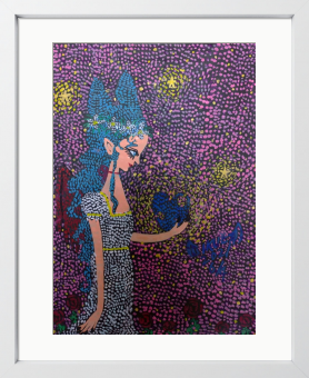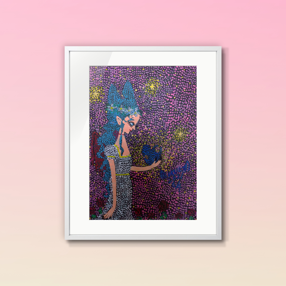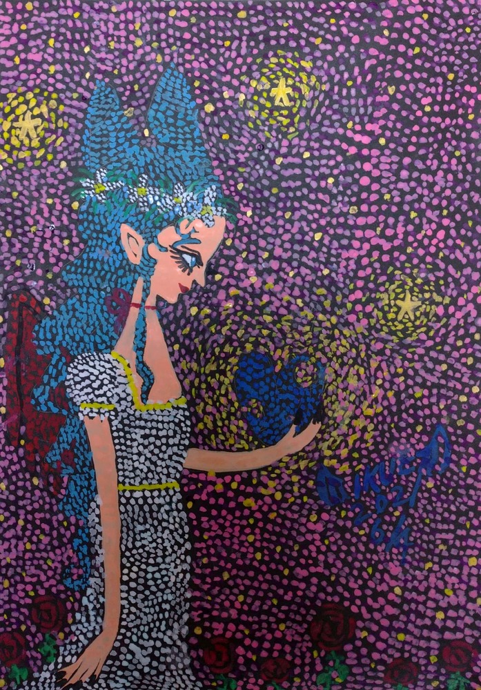 画材 アクリル絵の具 技法 点描画 心の中の妖精の世界にいる 幼い少女。 何の先入観も無く微笑み、 青ざめた心を差し出す。 オープンハートを モチーフに描きました。