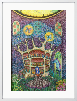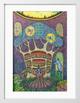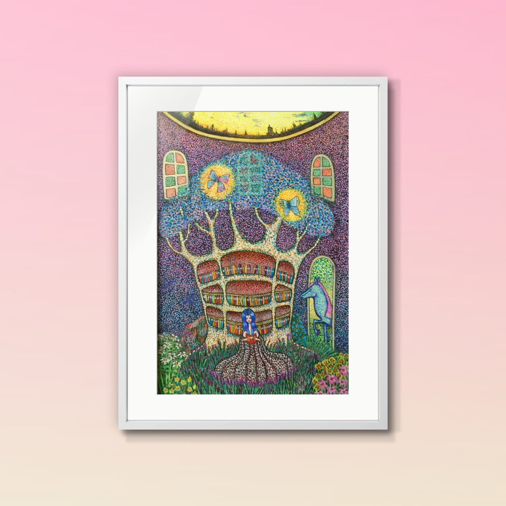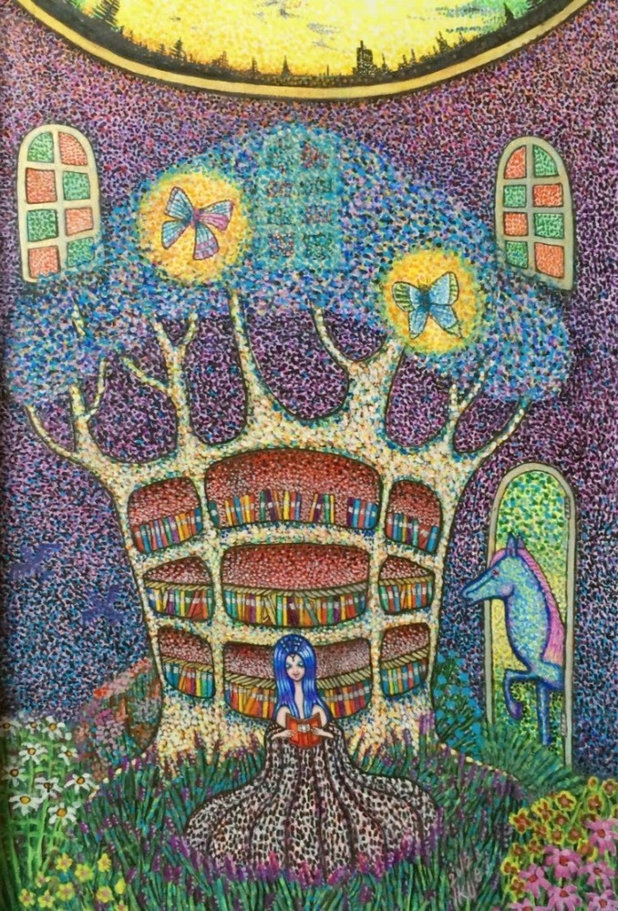 画材 アクリル絵の具 技法 点描画 はこだて冬アート展 NHK放送局局長賞受賞作品 童話ピノキオに登場する 子守をする妖精 ブルーフェアリーを 描きました。
