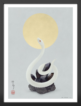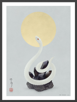 黒水晶に蛇の白。 日の丸を思わす白地の赤目に金の月。 縁起のいい絵として描きました。