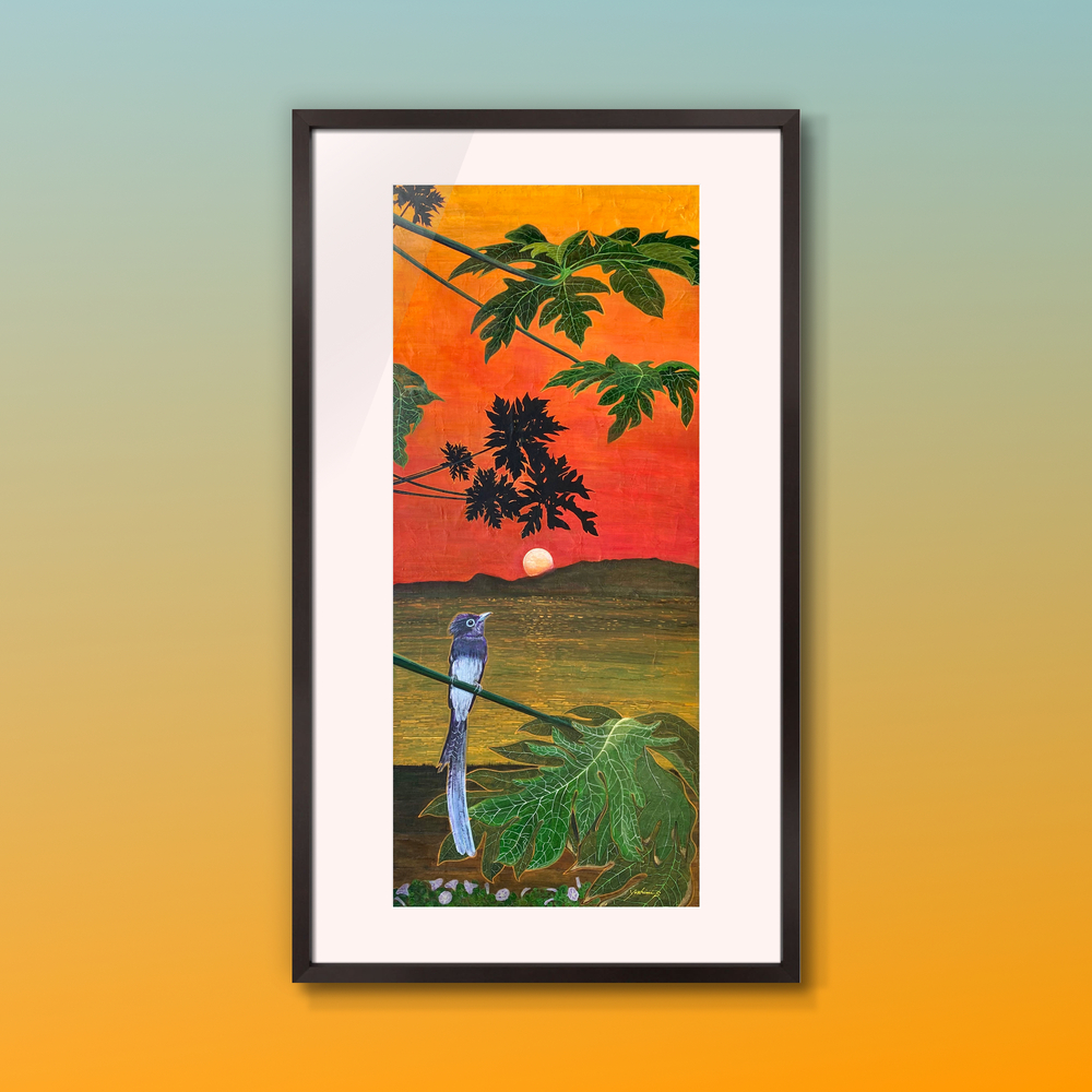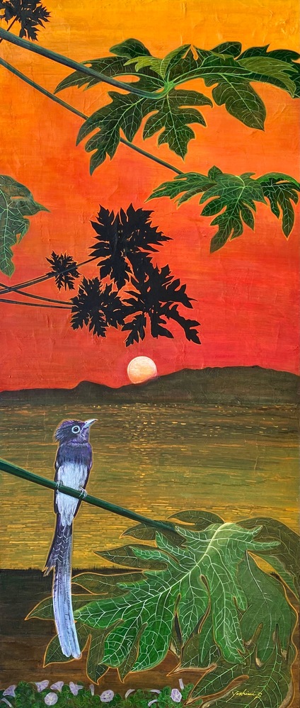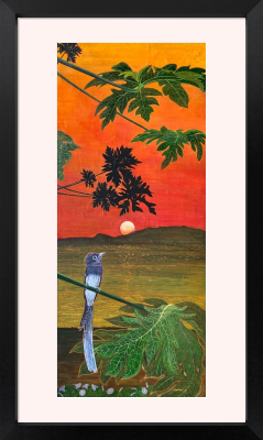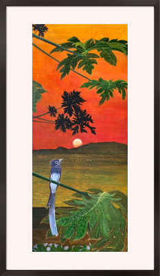 パパイヤの長い枝と特徴的で大きな葉っぱが南国ムードを醸し出す。渡り鳥のサンコウチョウが、沈みゆく夕日を眺める。静かに一日が暮れる、寂しげながらも気分は悪くないひと時を描いた作品。