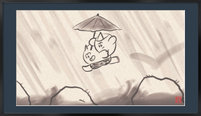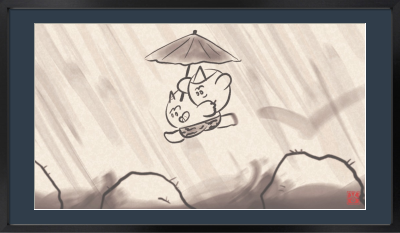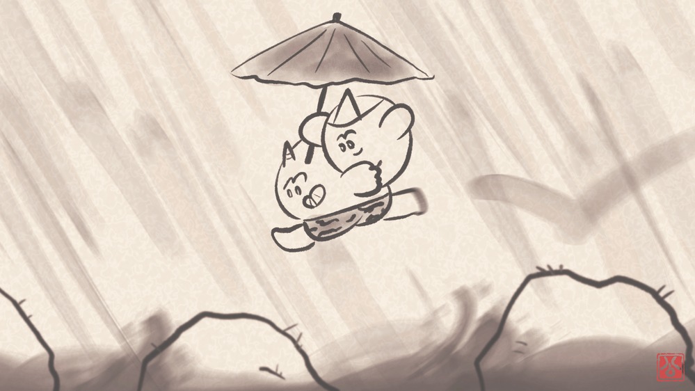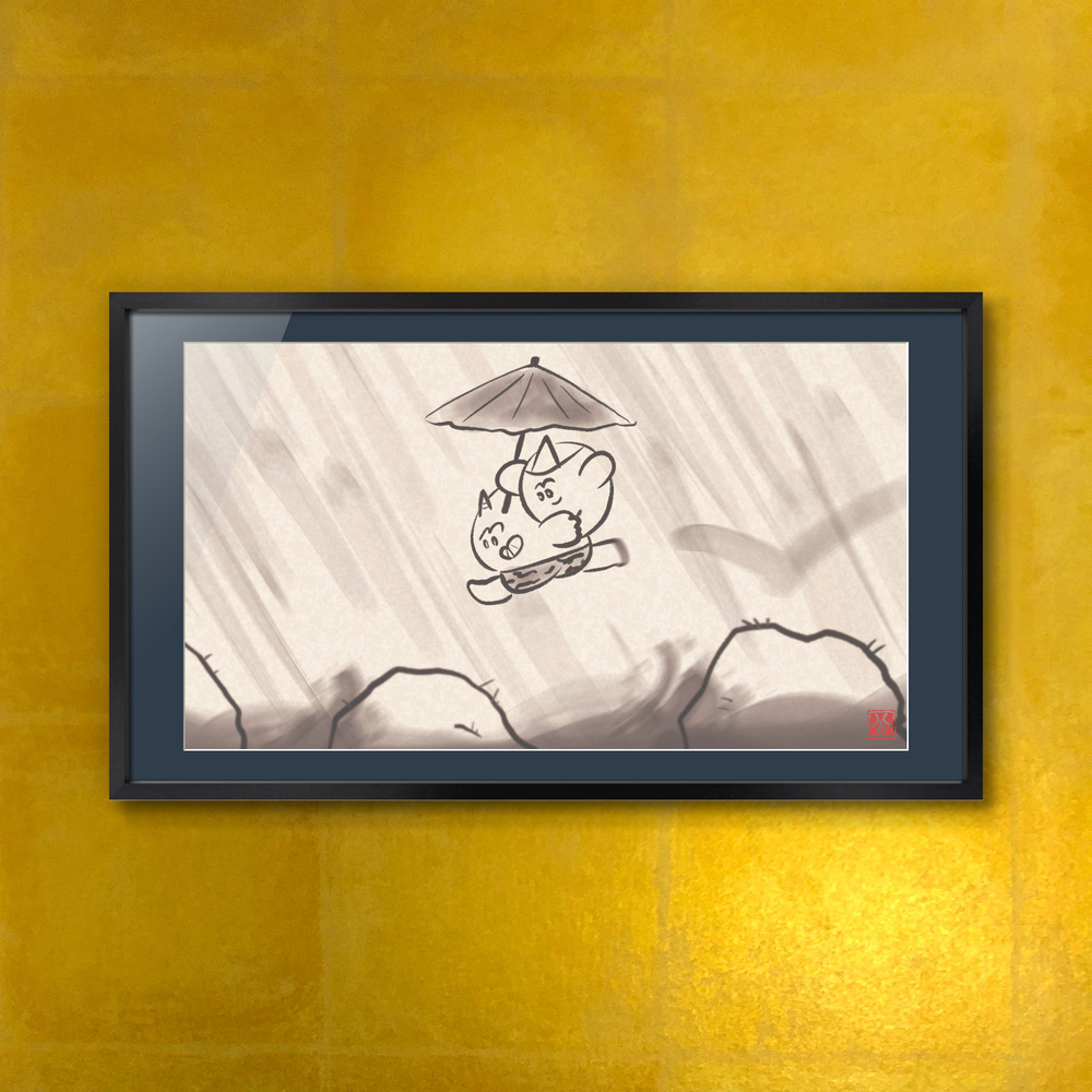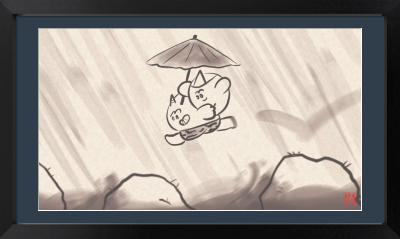 墨絵の戯画「霊和 陰陽 戯画(れいわ いんよう ぎが)」シリーズ。 大雨で濁流となった川を軽やかに下る鬼と先祖。