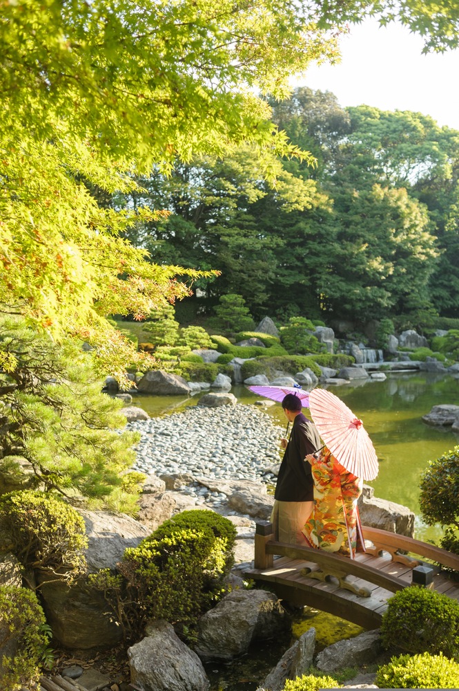 色打掛と紋付袴、和装の新郎新婦が、寄り添い静かに歩く、煌びやかで美しい日本庭園の情景。