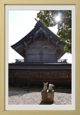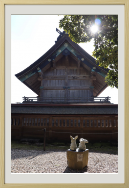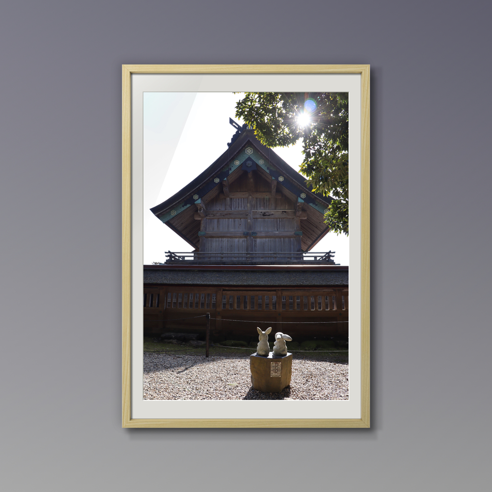 光芒が降り注ぐ出雲大社本殿を、二匹のうさぎの石像が静かに寄り添い見上げている情景を、柔らかで神々しい木漏れ日とともに撮影。 偶然の光の角度が生む特別な瞬間を捉えた希少性の高い一枚。 特に本作は、同じ撮影ポイントの写真が多く出回る中、神々しい光が差し込む“希少性の高いカット”で、差別化を図りたい方に最適です。