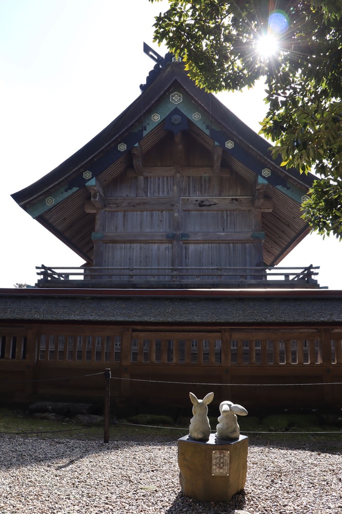 Title:神の御光が輝く出雲大社本殿と静かに寄り添う二匹のうさぎ像