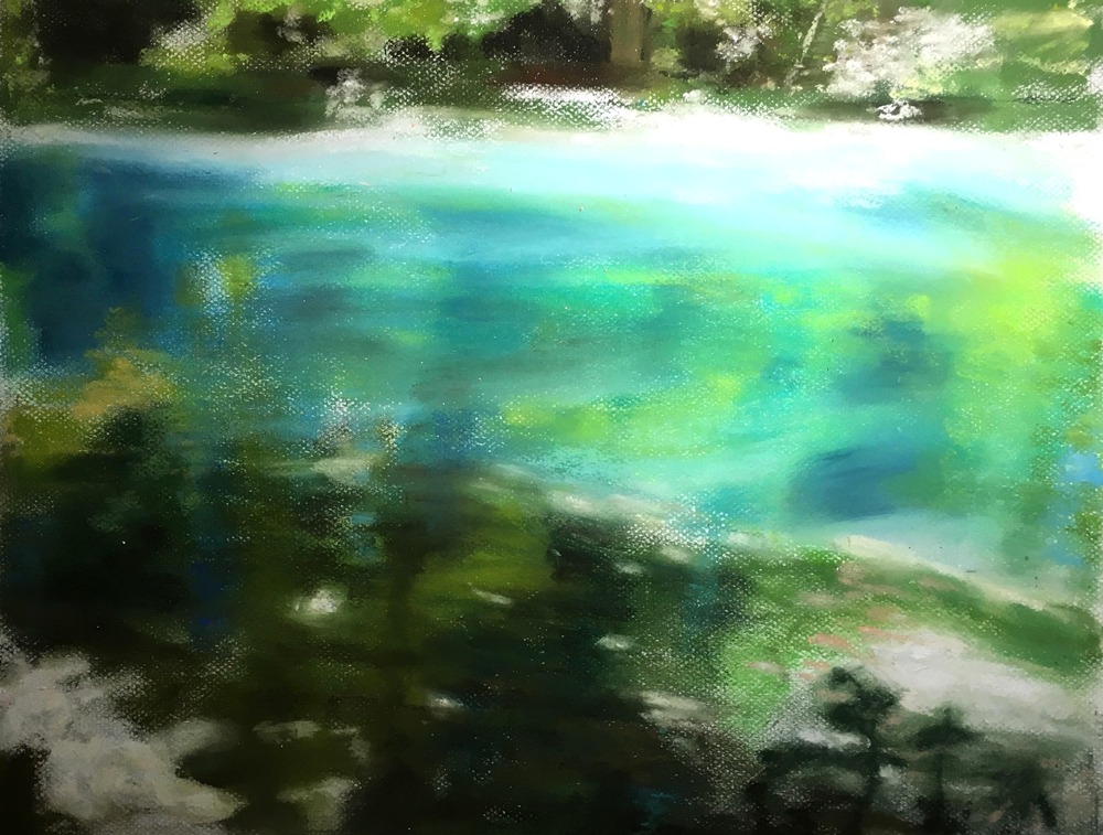 この作品は、ヨーロッパを旅していた時のスイスのインターラーケンに流れる川をモチーフに描いた作品です。豊かな森、高山から流れる川の水面は、エメラルドグリーン色でとても綺麗で神秘的でした。 水面に反射する光、色、透明感を大切に描いた作品です。
