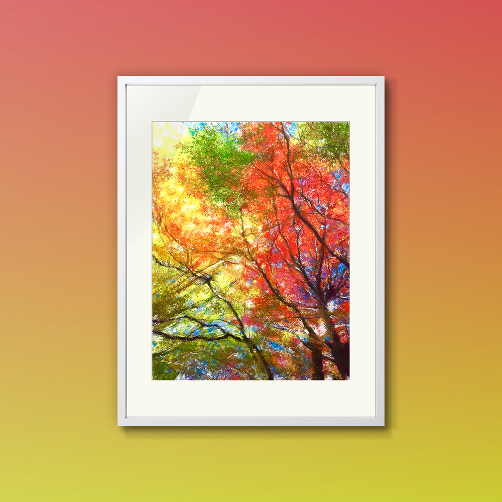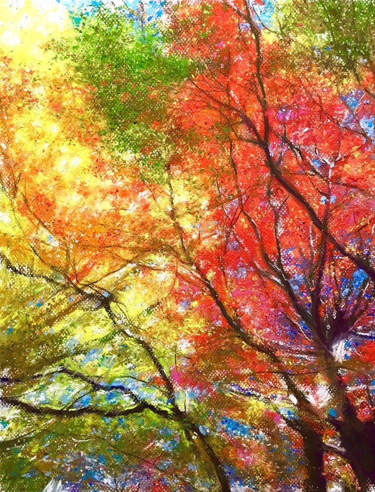 この作品は、京都の大原野にある平安時代から続く、由緒ある天空のお寺「三鈷寺」の参道の紅葉を描いた作品です。染め行く紅葉のグラデーションはとても綺麗で、木漏れる光はキラキラとしていました。