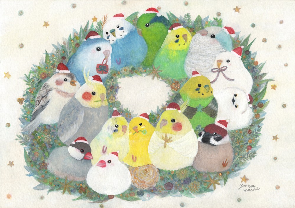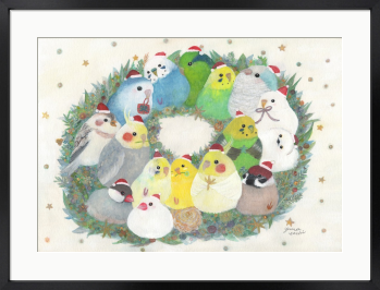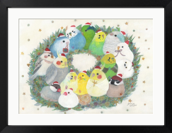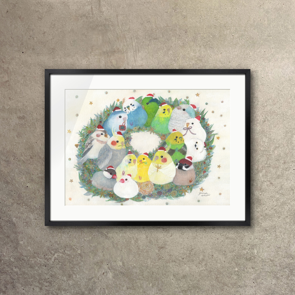 クリスマスのインテリアアートとしてもかわいい一枚です。 華やかな色合いと愛らしい表情が、見る人を笑顔にしてくれます。 ユキホオジロ コザクラインコ セキセイインコ マメルリハ オキナインコ シマエナガ スズメ オカメインコ 文鳥