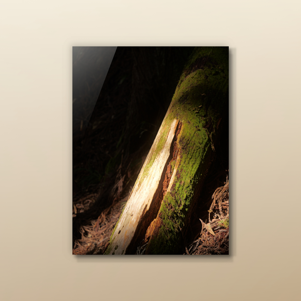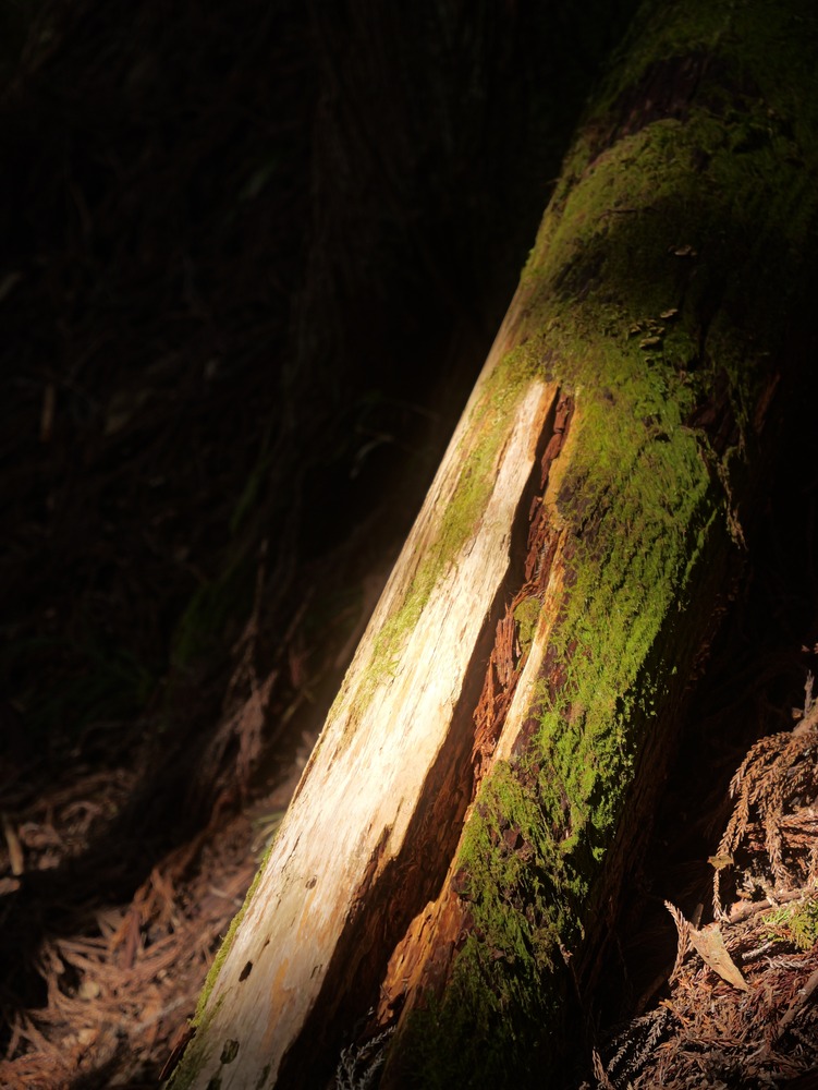 午前の柔らかい木漏れ日が照らした、幹と苔の小さなステージを見つけました。