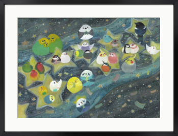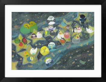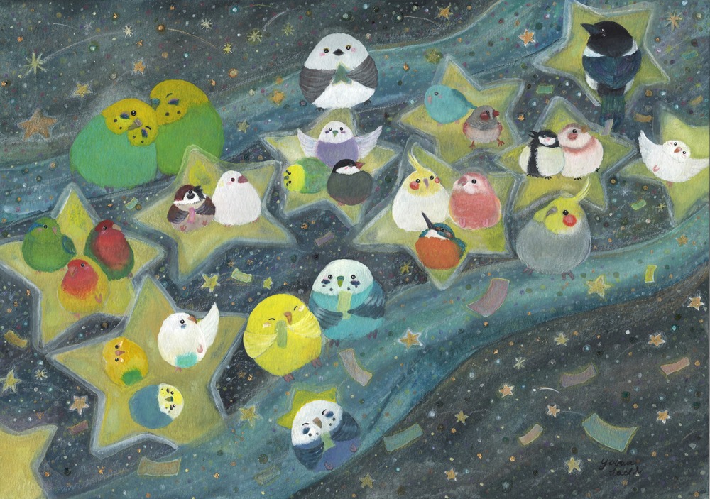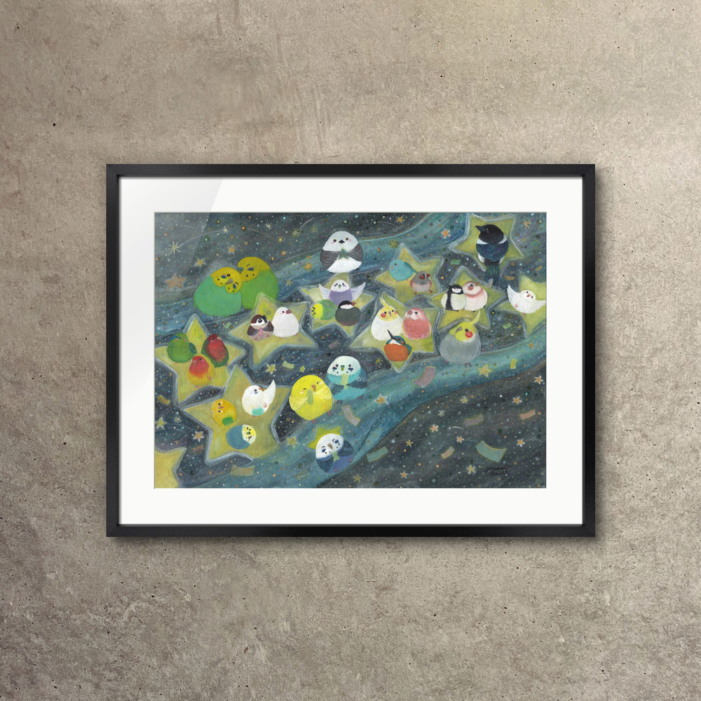 天の川にいる小鳥たちを描きました。 セキセイインコ シマエナガ マメルリハ コザクラインコ 雀 文鳥 キンカチョウ シジュウカラ ユキホオジロ カササギ オカメインコ アキクサインコ カワセミ もしも…鳥たちの世界があったなら……。 自由に物語を想像していただけましたら幸いです。 大切な方への世界に1つだけの贈り物、お部屋に飾るインテリアアートとしてもおすすめの1枚です。
