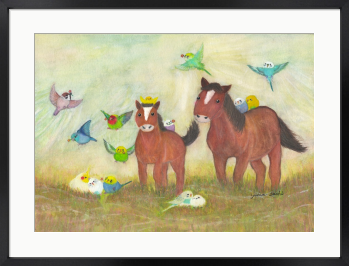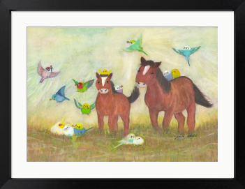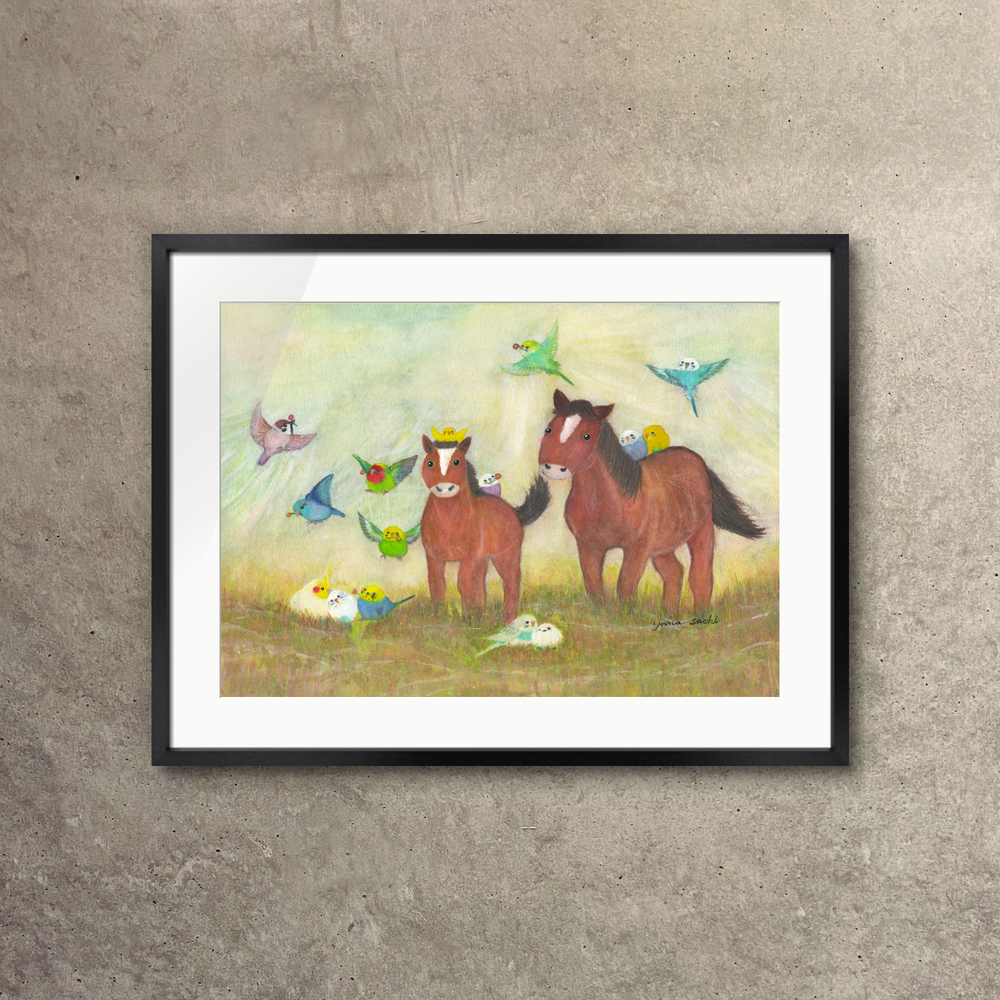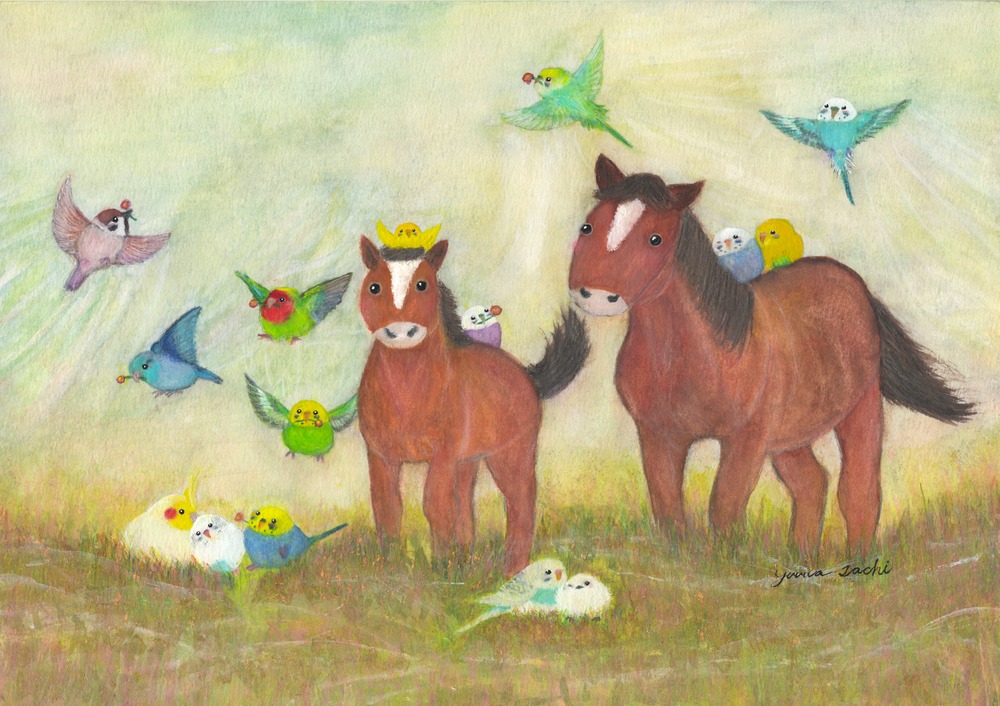 親子の馬とふわふわの小鳥たち。 柔らかな光と楽しそうな小鳥たちに癒されるかわいい1枚です。 来年が素敵な一年となりますようにと願いをこめて描きました。 楽しそうに舞い上がる小鳥たちが、見ているだけで癒しをもたらしてくれます。 馬 セキセイインコ オカメインコ コザクラインコ マメルリハ スズメ ~もしも小鳥たちの世界があったなら~ 小鳥たちの物語を自由に想像していただけましたら幸いです。